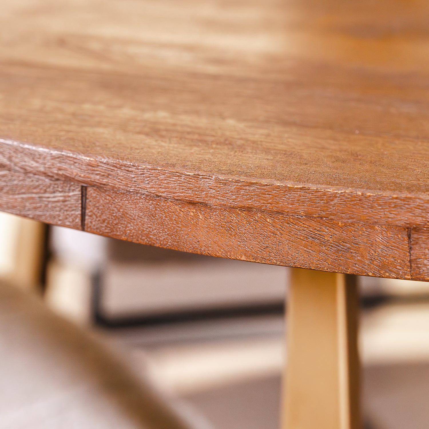 De bruine tint van het mangohout voegt een natuurlijke, tijdloze esthetiek toe aan je interieur. De hogere schuine afgewerkte poot geeft de tafel een eigentijdse uitstraling en maakt het een aantrekkelijk middelpunt voor gezellige diners en samenzijn.