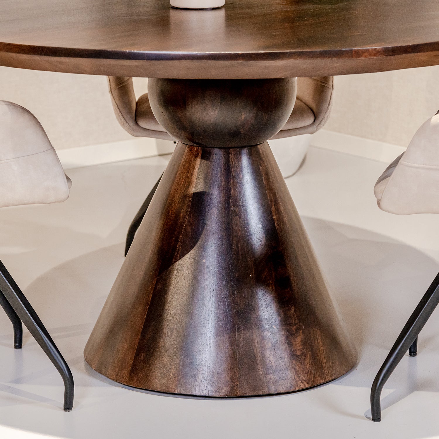 Opzoek naar een charmante ronde eettafel? Dan zou Eettafel Brix Balthazar wel eens perfect passen in jouw interieur! Deze eettafel is uniek door de prachtige vormen. Prachtig is dat het tafelblad schuin afloopt. Ook wel verjongd genoemd. Hierdoor heeft het tafelblad een strakke uitstraling. Dit ontstaat ook doordat het blad prachtig doorloopt in het kegelvormig onderstel met een ronde afwerking.