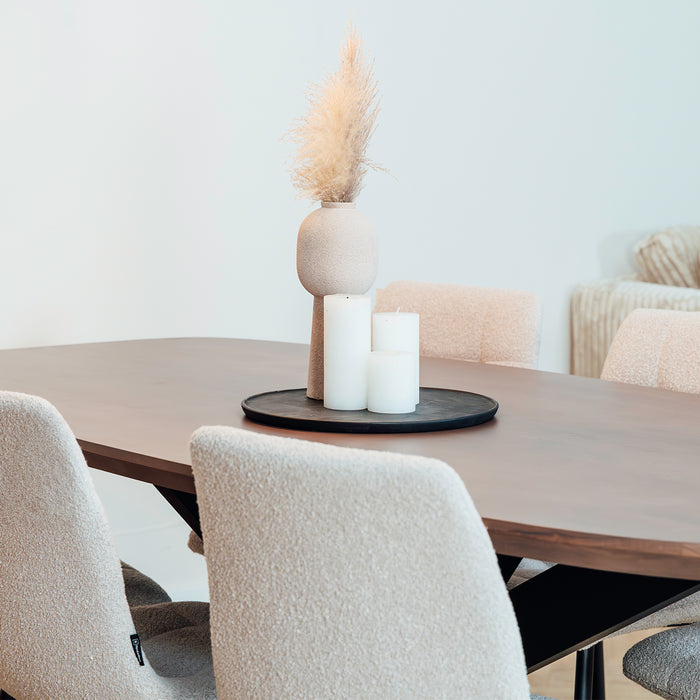 Breng stijl en warmte in je eetkamer met Eettafel Floor, een prachtige Deens ovalen eettafel met een verfijnde walnoot afwerking. Dit design combineert tijdloos mangohout met een robuust stalen onderstel, wat zorgt voor een harmonieuze balans tussen natuurlijk en industrieel. De royale vorm biedt voldoende ruimte voor gezellige diners en past perfect bij diverse interieurstijlen, van modern tot Scandinavisch.