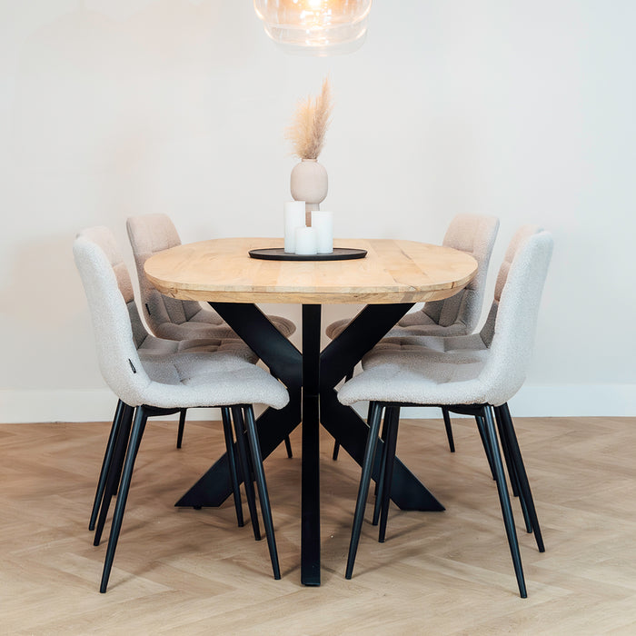 Breng stijl en warmte in je eetkamer met Eettafel Floor, een prachtige Deens ovalen eettafel met een verfijnde Naturel Mango afwerking. Dit design combineert tijdloos mangohout met een robuust stalen onderstel, wat zorgt voor een harmonieuze balans tussen natuurlijk en industrieel. De royale vorm biedt voldoende ruimte voor gezellige diners en past perfect bij diverse interieurstijlen, van modern tot Scandinavisch.