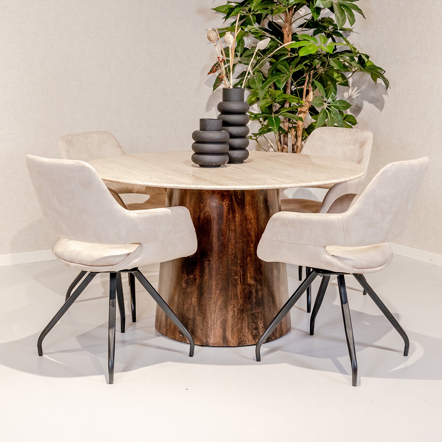 Eettafel Valentino is een stoere eettafel uitgevoerd in een onderstel van mangohout en een tafelblad van Travertin. Door dit mooie design is deze ronde eettafel perfect te combineren in ieder interieur.