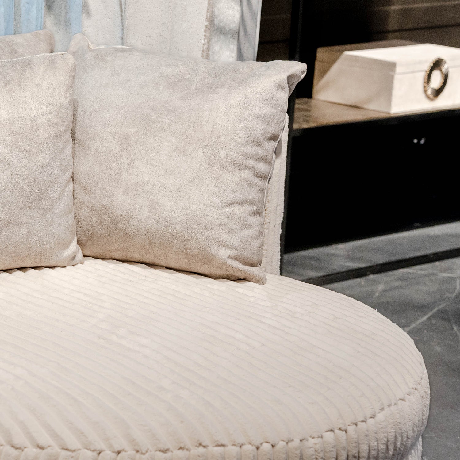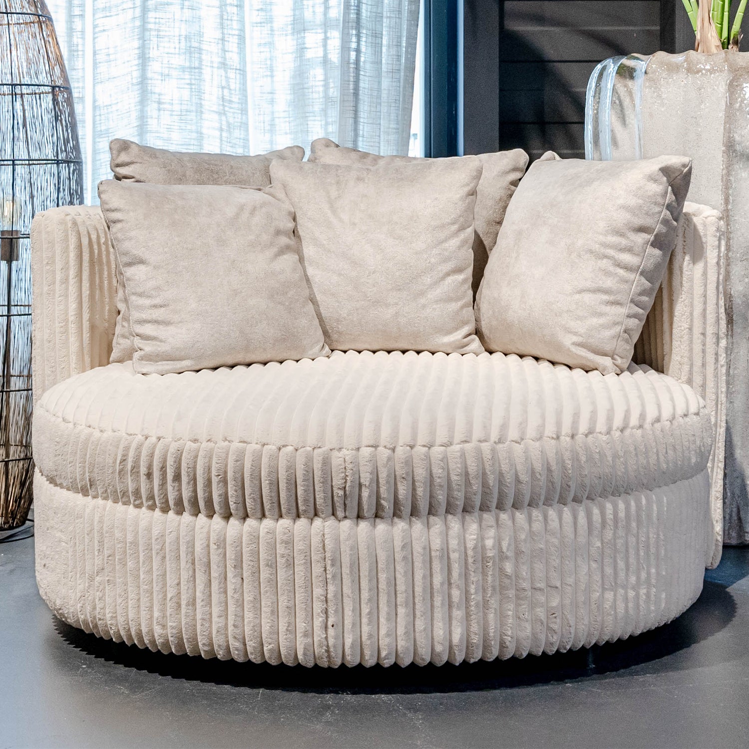 Stap binnen in een wereld van ultieme ontspanning en stijl met de Fauteuil Fayen in een verfijnde crèmekleur. Met zijn unieke ronde vorm en royale zitting biedt deze fauteuil het perfecte plek voor ontspanning, zowel alleen als met gezelschap. Met inbegrip van vijf zachte kussens, is de Fauteuil Fayen ontworpen om comfort en gezelligheid te bieden voor elk moment van rust en samenzijn.