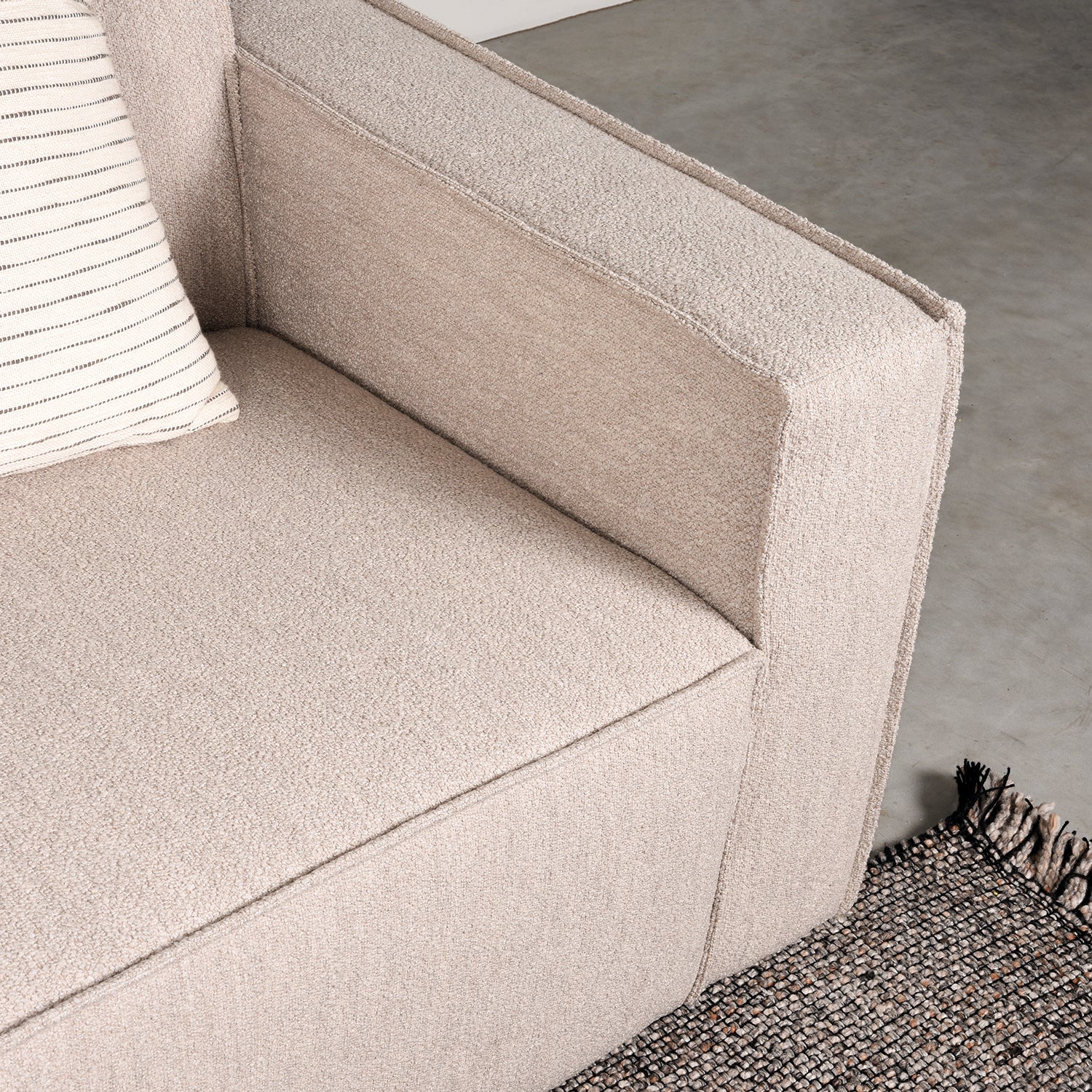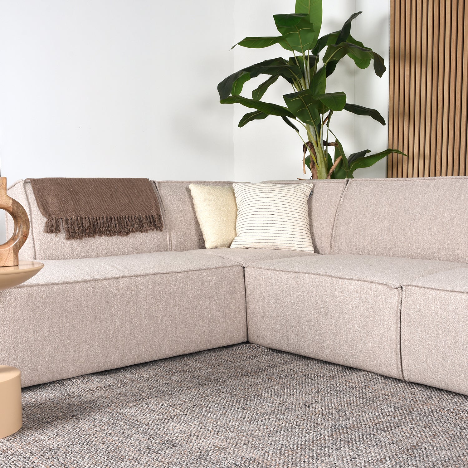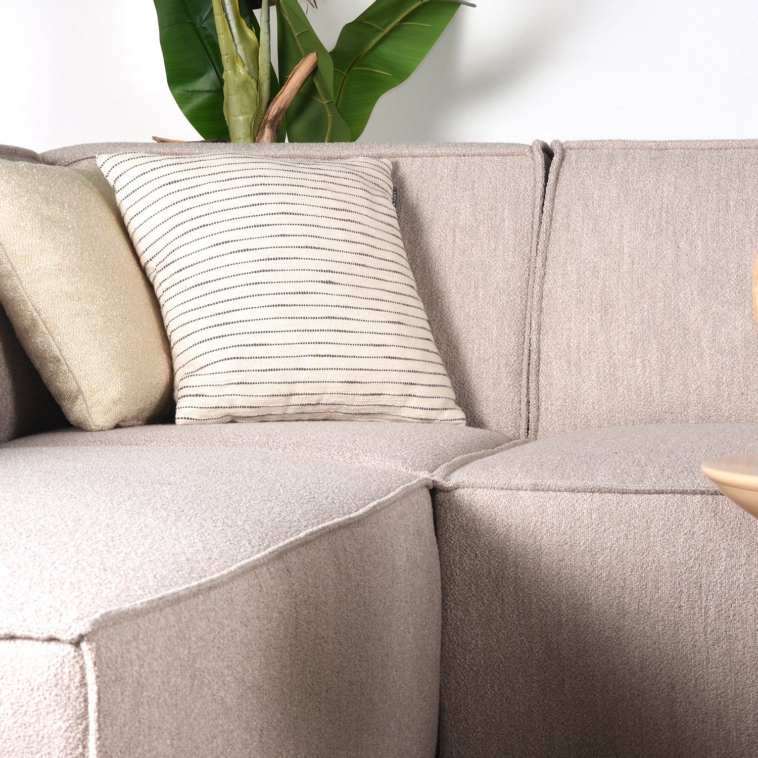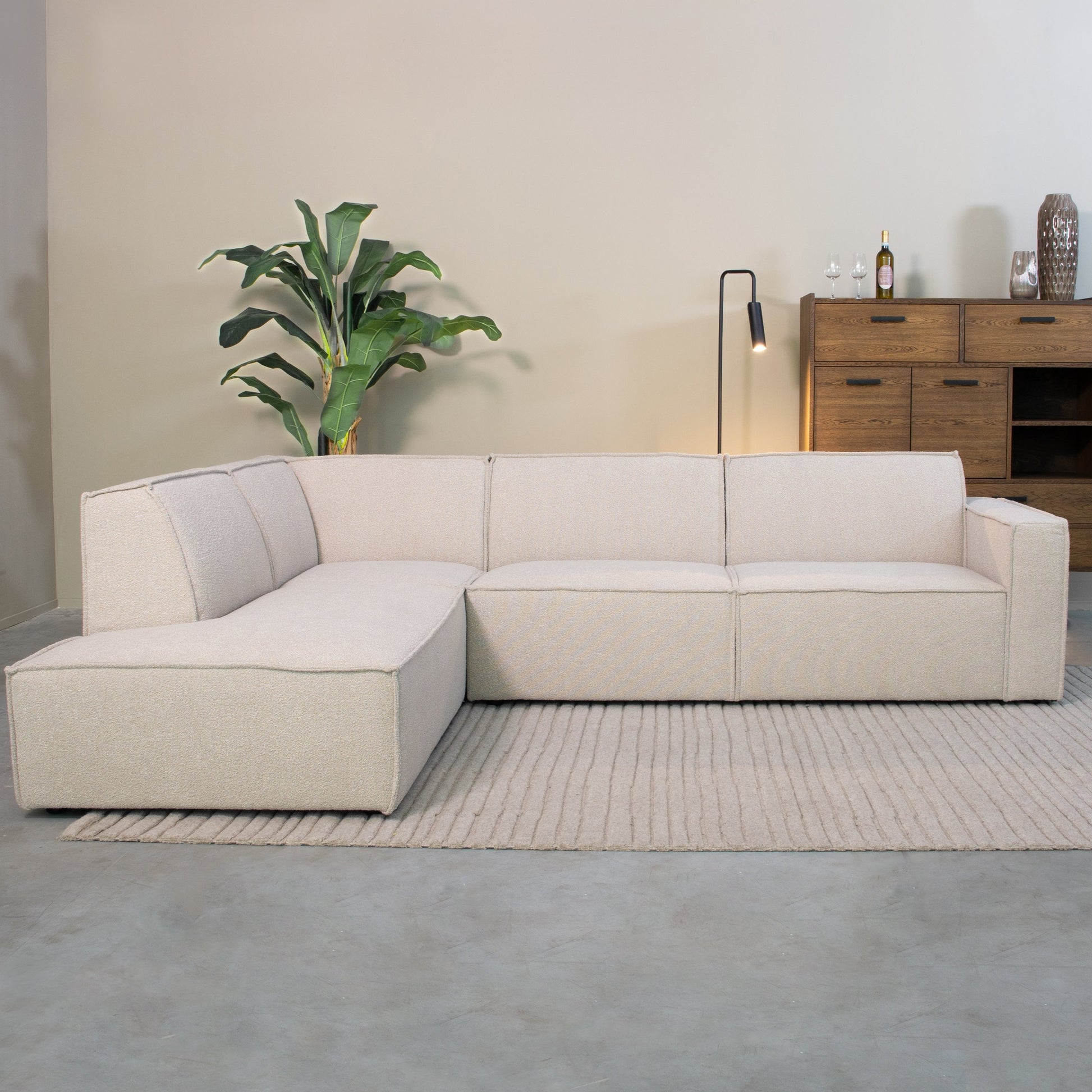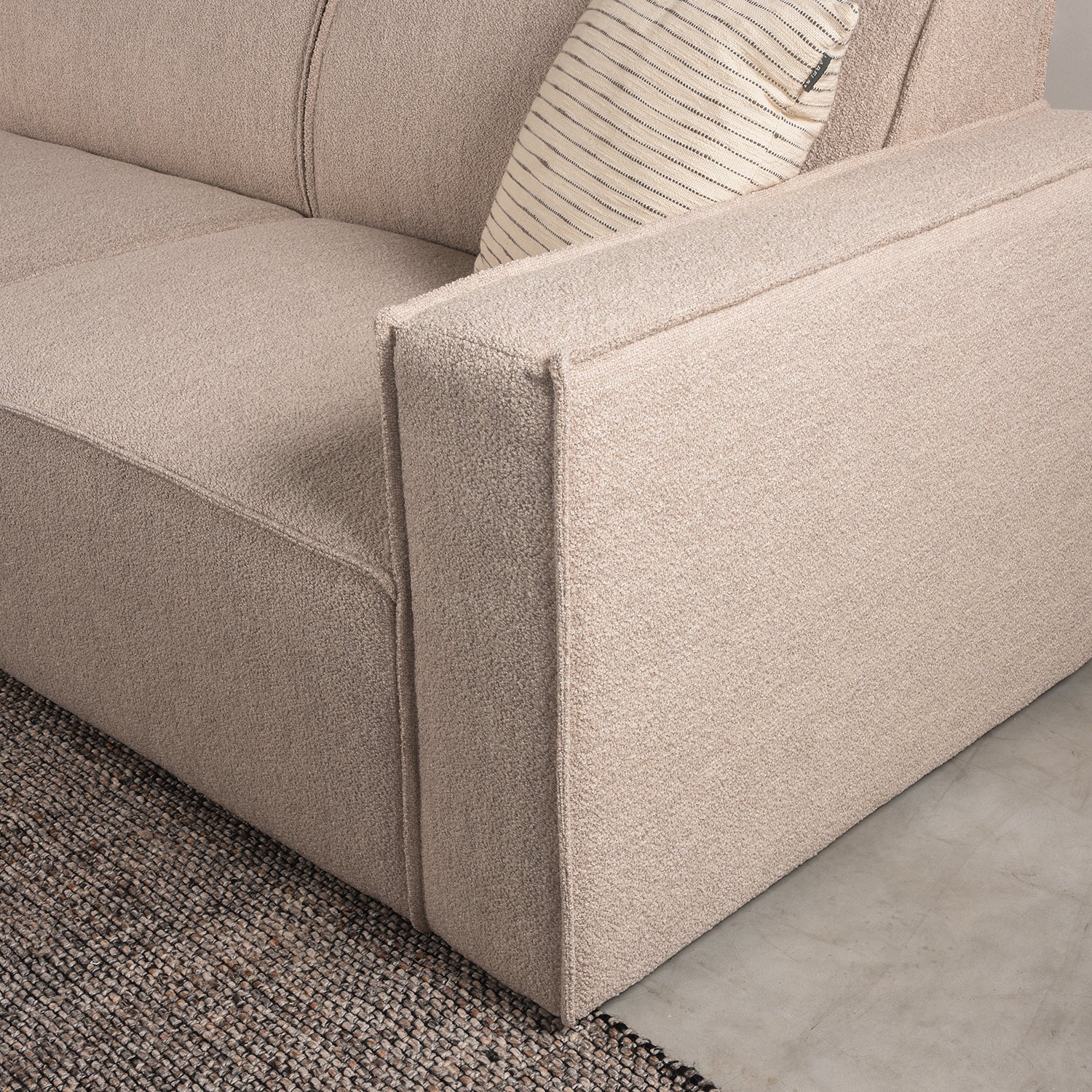 Ontdek hoekbank Kay, de ultieme luxe bank die je huis een krachtig en robuust statement geeft. Met zijn trendy natuurlijke bouclé stoffering en dichte dubbele stiksels, heeft deze bank een onregelmatig en speels oppervlak dat extra karakter aan je interieur geeft. De onzichtbare lage pootjes geven de illusie dat de bank zweeft, waardoor het een moderne en eigentijdse uitstraling heeft.