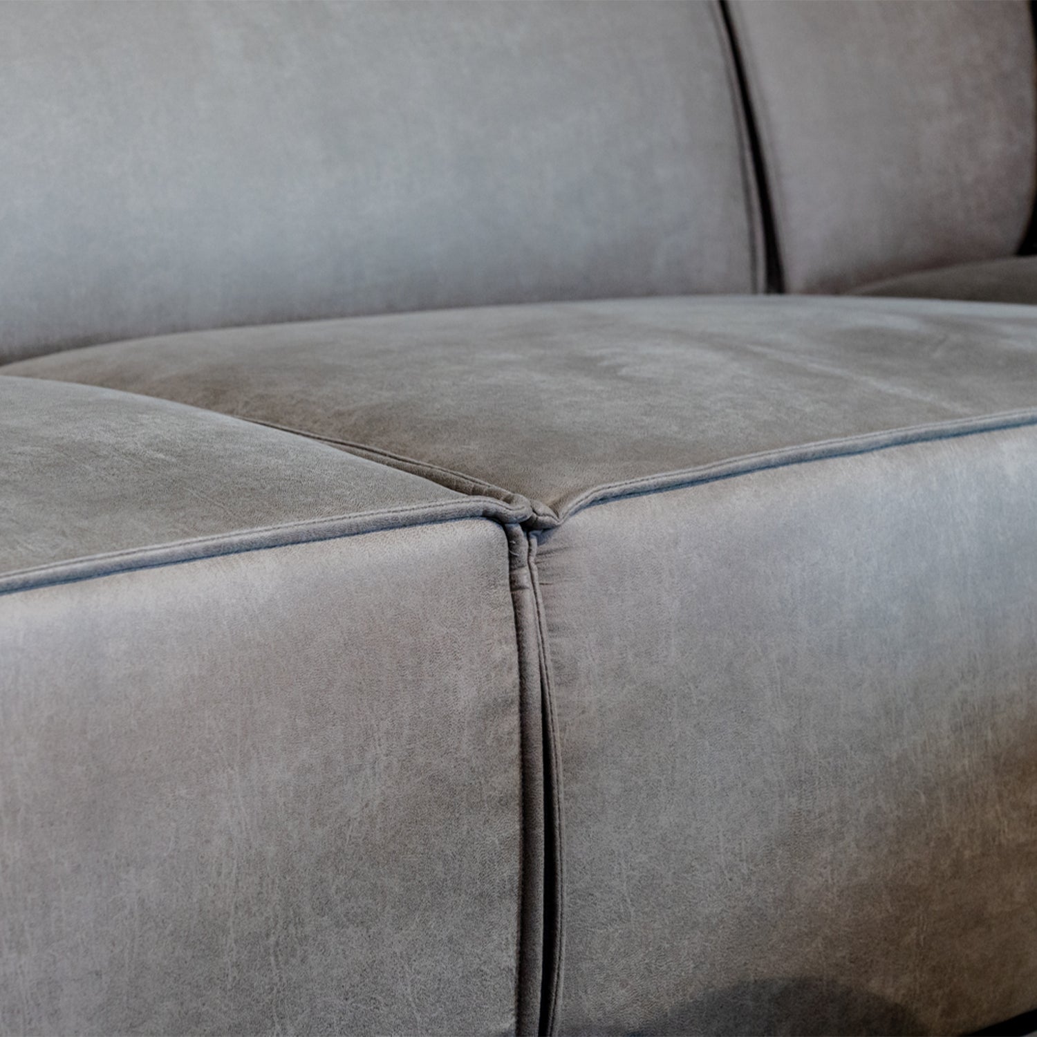 Kay is vast gestoffeerd in taupe micro suède, sterk en slijtvast. De dichte, dubbel gestikte naad geeft karakter en zorgt voor een nette uitstraling. Onzichtbare lage pootjes geven de illusie van zweven.
