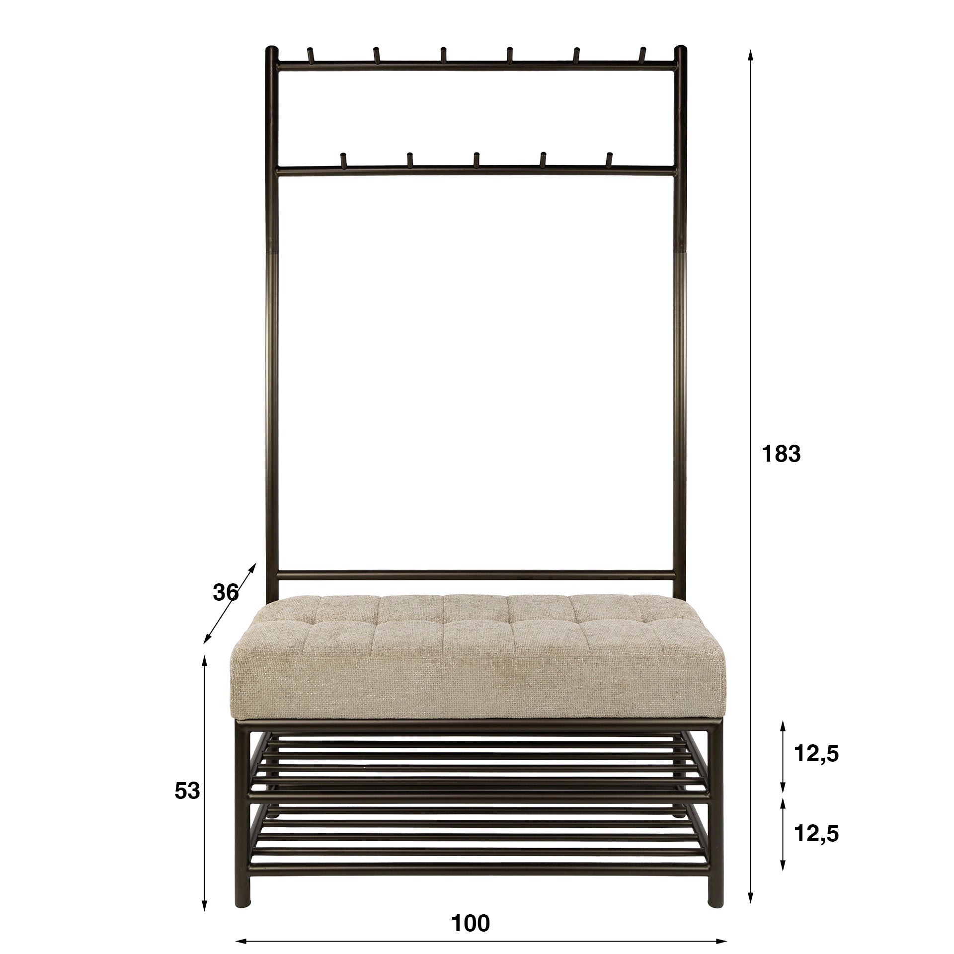 Onder de zitting bevinden zich twee stevige schoenenrekken van metaal, ideaal voor het netjes opbergen van sneakers, laarzen of pantoffels. Boven de zitbank is een hoge kapstok geïntegreerd met maar liefst tien stevige haken verdeeld over twee rijen – perfect voor jassen, sjaals of tassen.