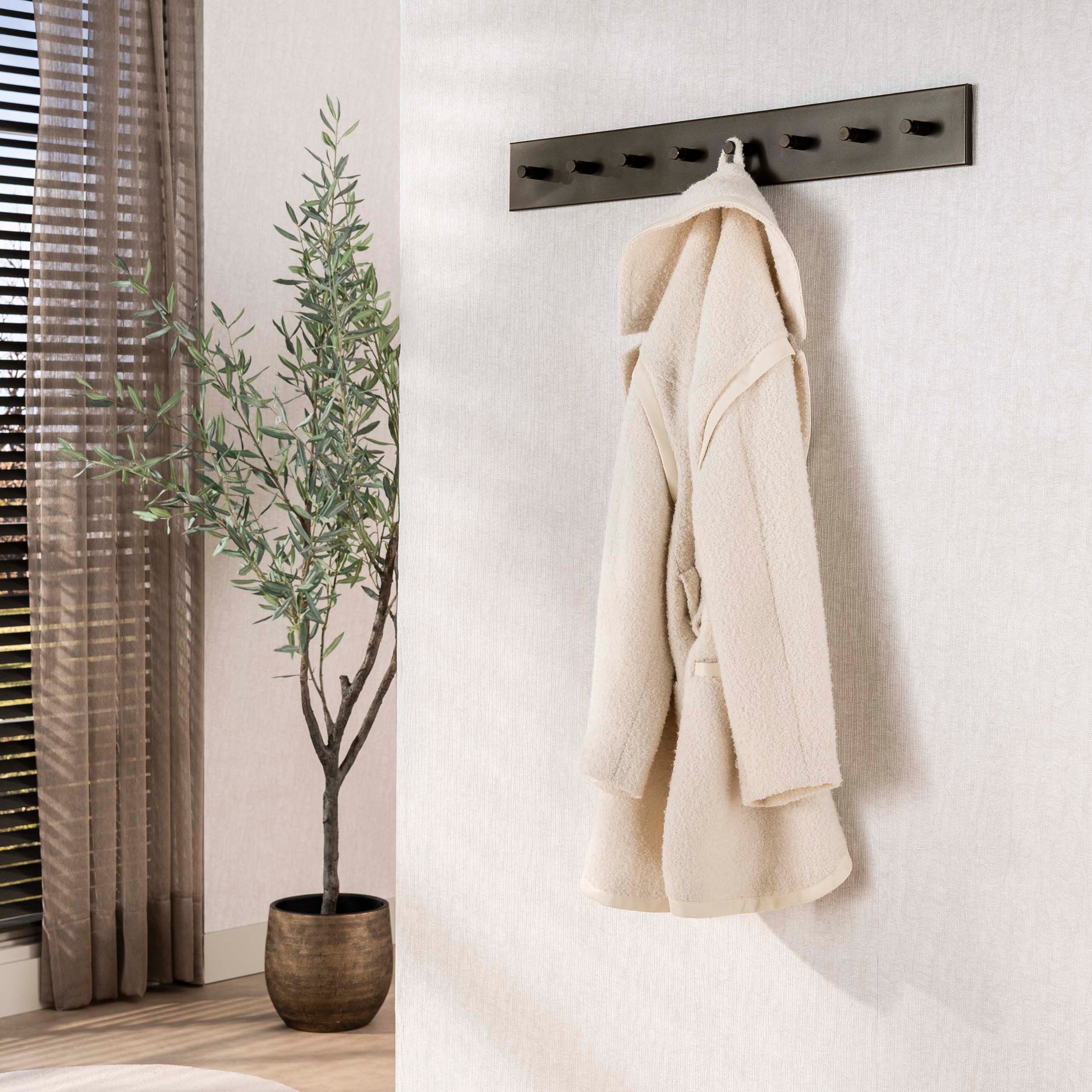 De robuuste metalen constructie maakt deze kapstok geschikt voor dagelijks gebruik, terwijl de zorgvuldig vormgegeven haken voldoende ruimte bieden voor jassen, sjaals en accessoires. De bronzen kleur zorgt voor een warme uitstraling die goed samengaat met materialen als hout, travertin of zachte stoffering. Of je nu kiest voor de 60 cm variant in een compacte entree of de 80 cm voor een royale gang, kapstok Nore voegt direct klasse toe aan de ruimte.