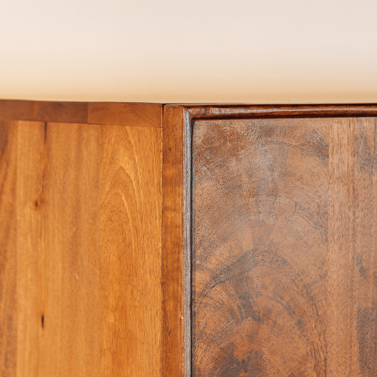 De kast Maya combineert een prachtige natuurlijke uitstraling met stoer industrieel design. Deze kast is gemaakt van duurzaam mangohout, een materiaal dat bekendstaat om zijn robuustheid en unieke houtnerfpatronen, wat elke kast een eigen karakter geeft. De afwerking in de kleur naturel benadrukt de warme tinten van het mangohout, waardoor deze kast perfect past in zowel moderne als meer landelijke interieurs. De stevige, stalen zwarte poten geven de kast een eigentijdse en industriële uitstraling, terwijl ze zorgen voor stabiliteit en een stoer contrast vormen met het hout.