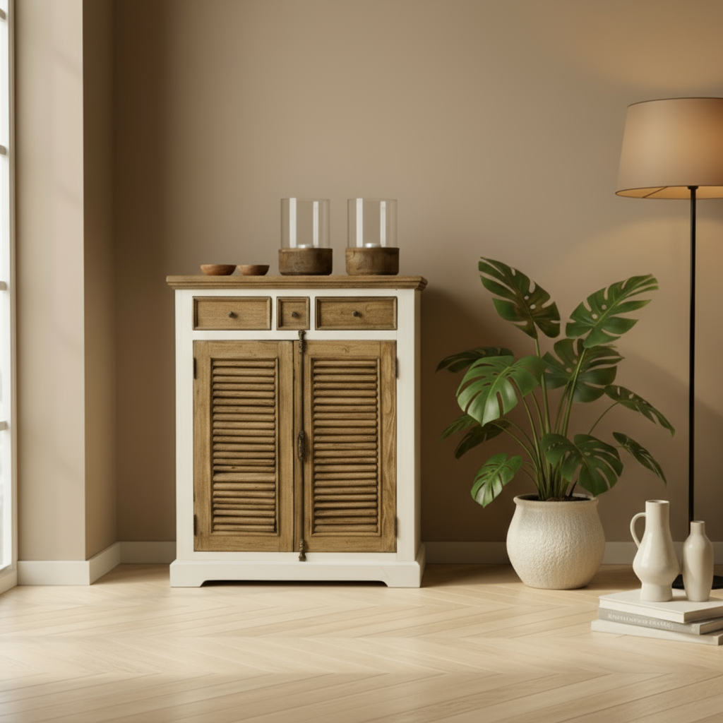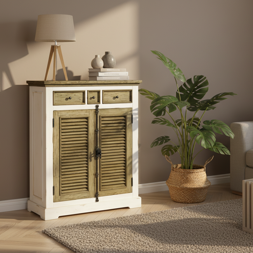 De Ladekast Amanda in wit van Towerliving straalt landelijke charme en tijdloze elegantie uit. Het witgelakte frame vormt een stijlvol contrast met het natuurlijk afgewerkte houten blad en de lameldeuren, die het meubel zijn authentieke uitstraling geven. Dankzij deze combinatie van warme houttinten en frisse witte kleuren brengt de Amanda direct sfeer in elke ruimte.