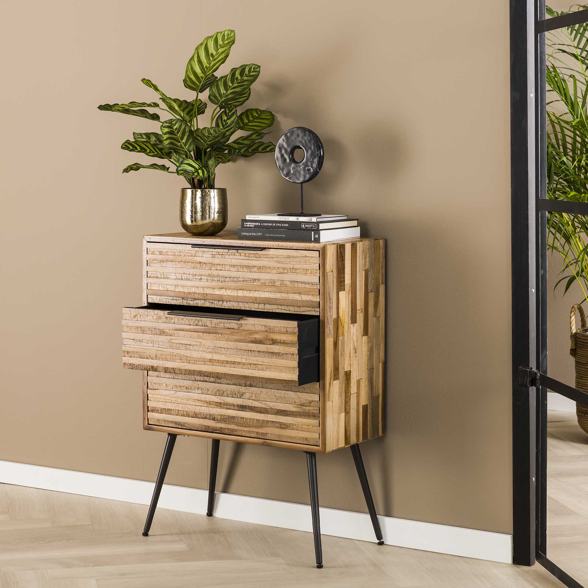 Het unieke design ontstaat doordat de strookjes verweerd teakhout aan de voorzijde zijn opgelegd. Aan de zijkanten is ook een speels effect gecreëerd. Door de kleur van teakhout is deze ladekast in veel interieurs te combineren. Meubels van teak staan er om bekend om lange tijd in goede staat te verkeren. Het is een duurzame houtsoort die vrij weinig na werkt.