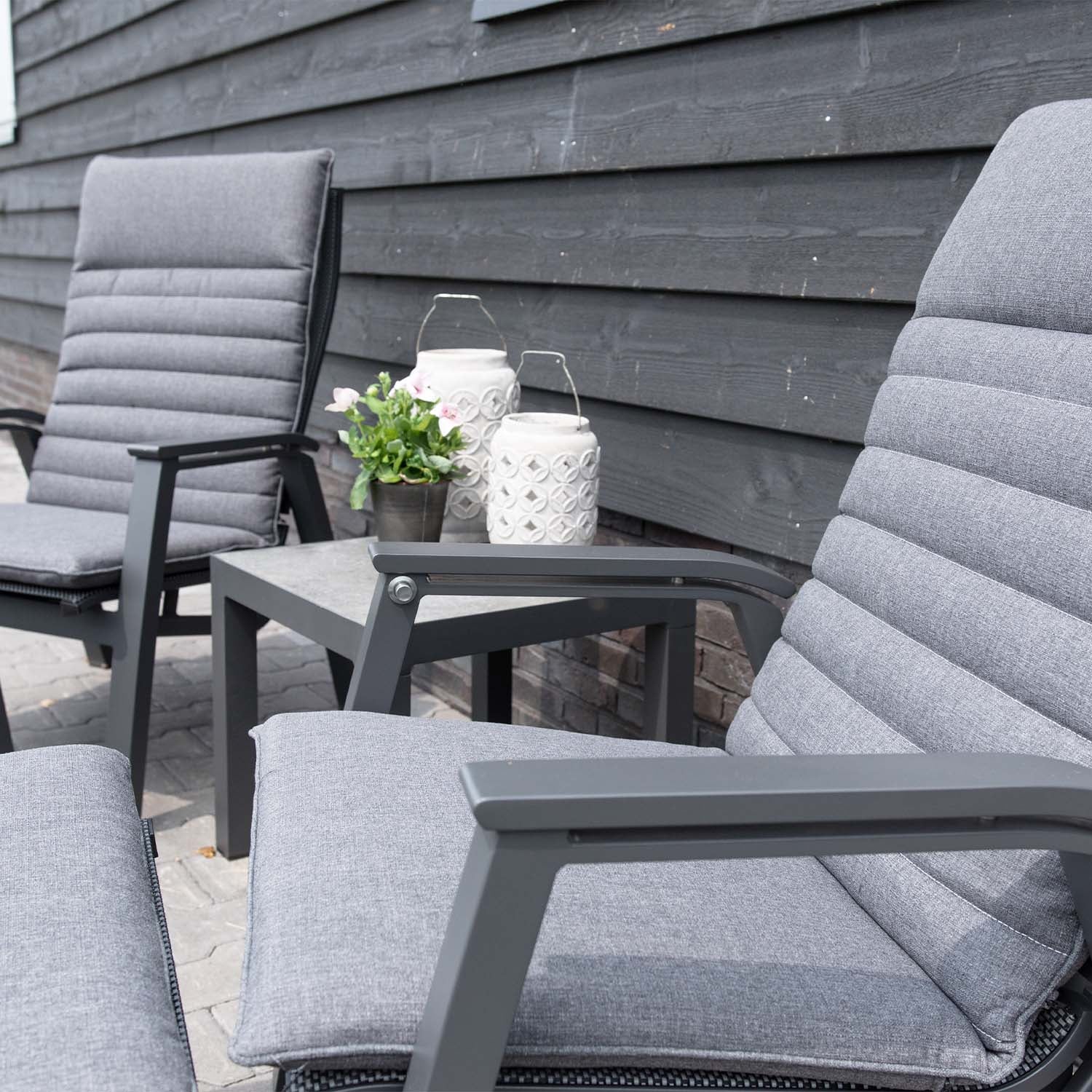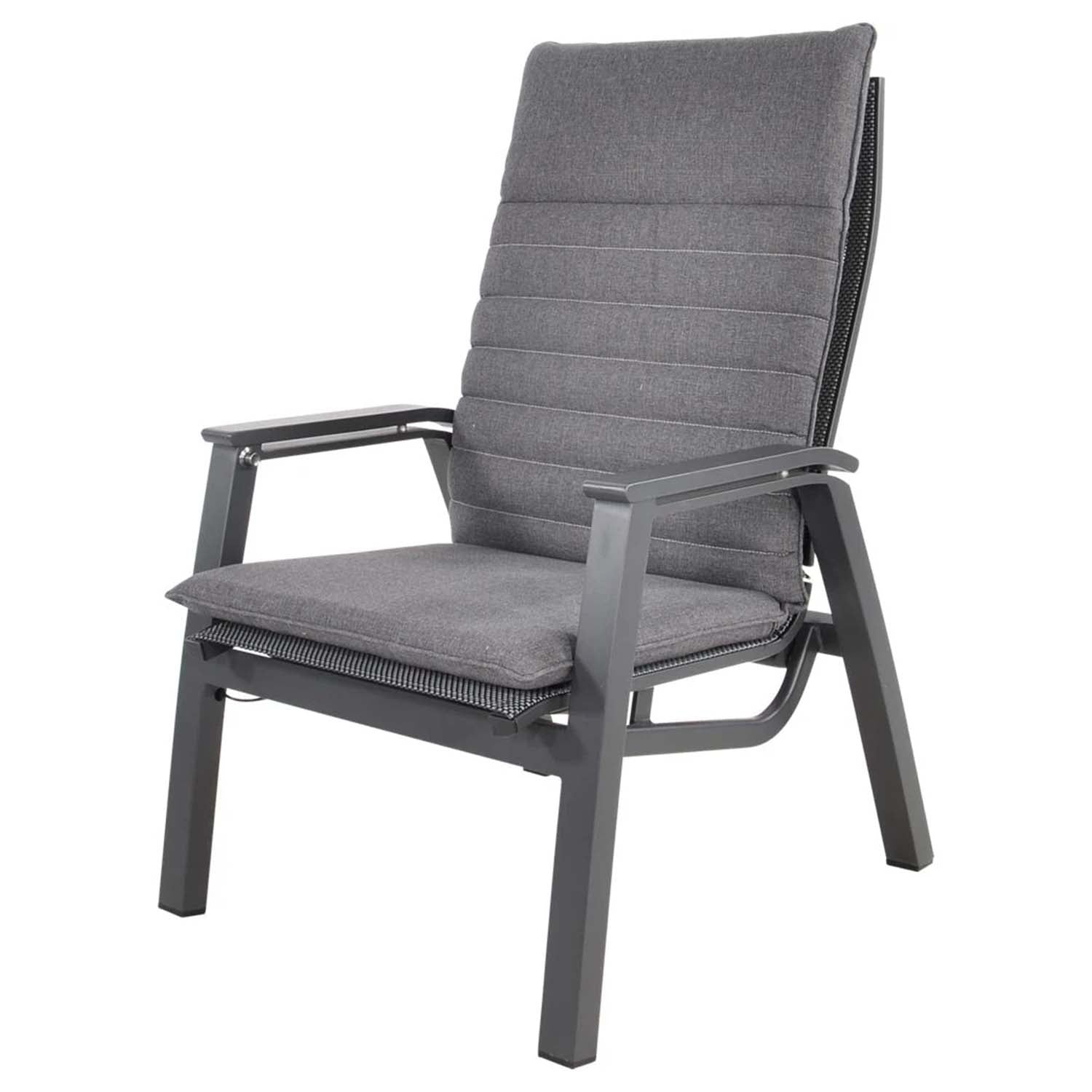 Dit tuinmeubel is voorzien van een hoogwaardig olefin kussen in donkergrijs, wat zorgt voor extra comfort en duurzaamheid. De zit-en rugleuning zijn bekleed met zwartgrijze textiel stof, die zowel stijlvol als weerbestendig is. De rugleuning is verstelbaar, waardoor je altijd de perfecte zithouding kunt vinden. Met een zithoogte van ongeveer 42,5 cm en armleuninghoogte van 60 cm biedt deze stoel optimaal comfort.