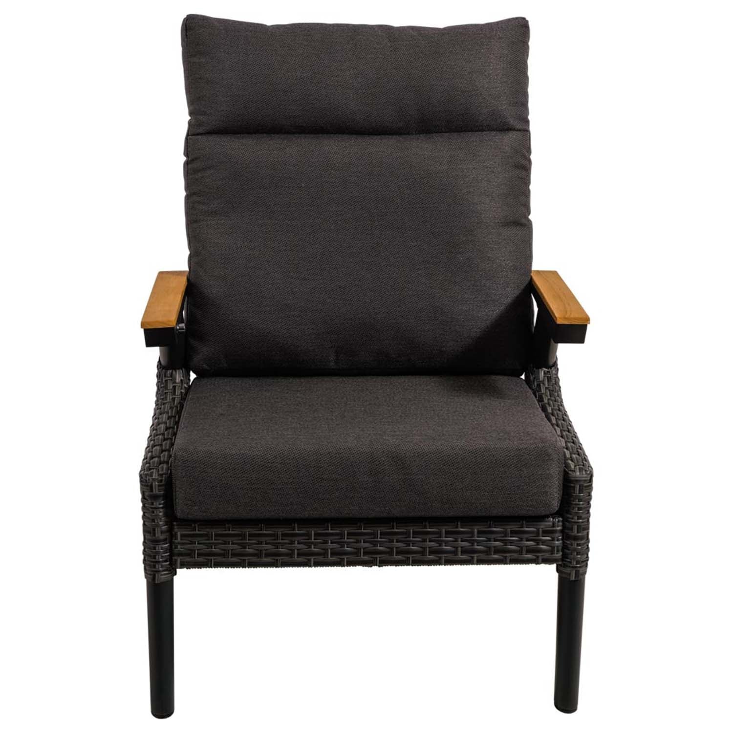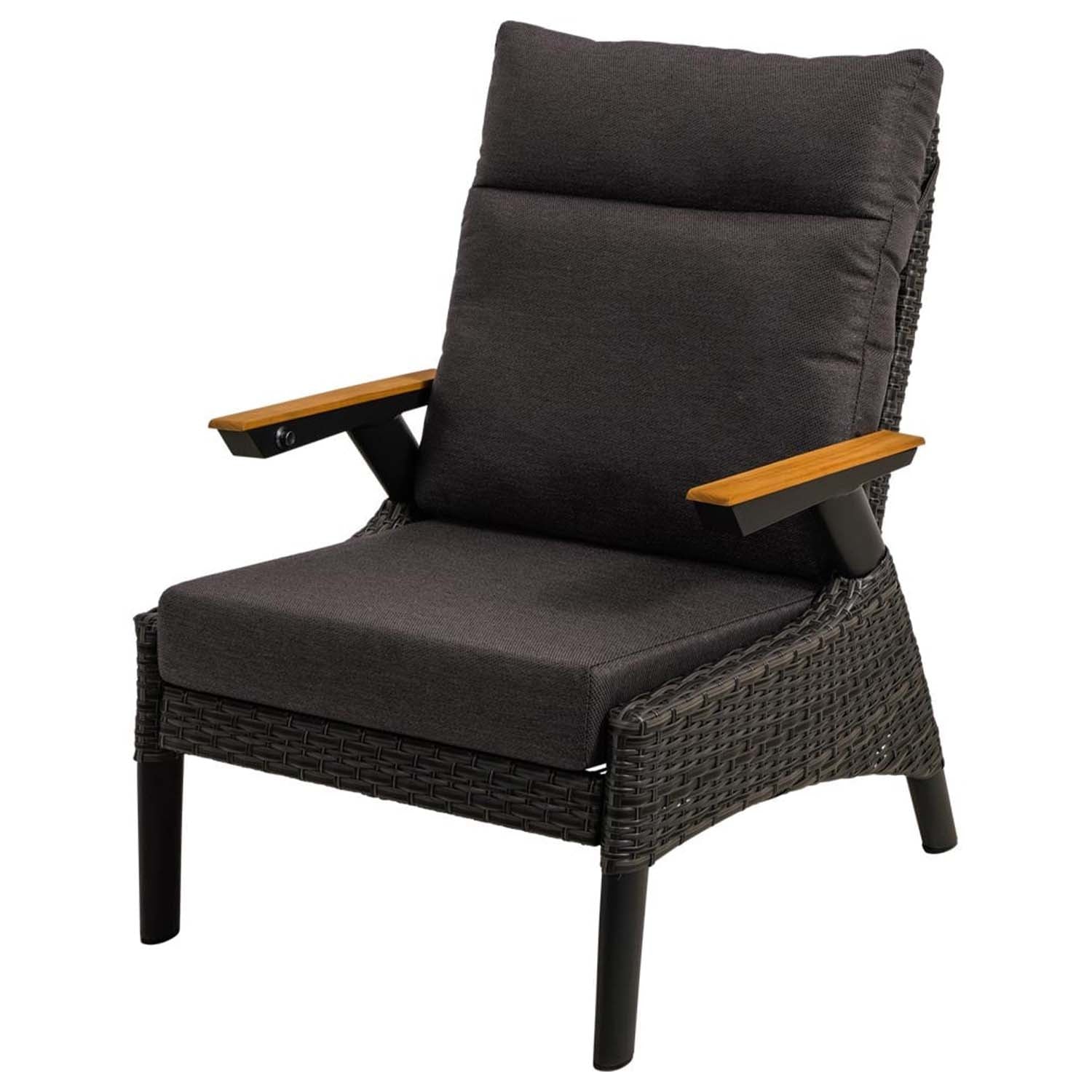 Dit tuinmeubel is voorzien van hoogwaardig donkergrijs Olefin kussens van, wat zorgt voor extra comfort en duurzaamheid. De rugleuning is traploos verstelbaar door middel van een gasdrukveer, waardoor je altijd de perfecte zithouding kunt vinden. De teakhouten armleuningen voegen een extra vleugje luxe toe aan het ontwerp.
