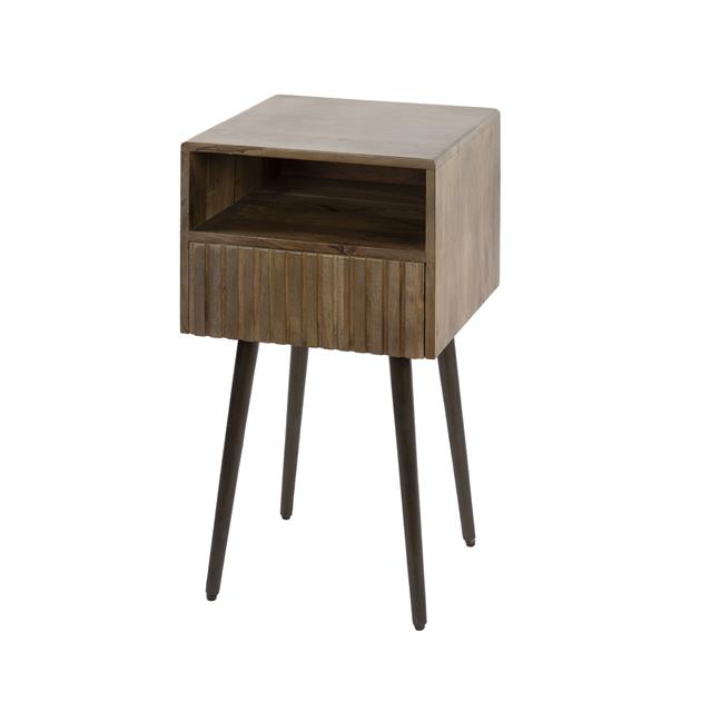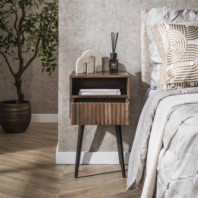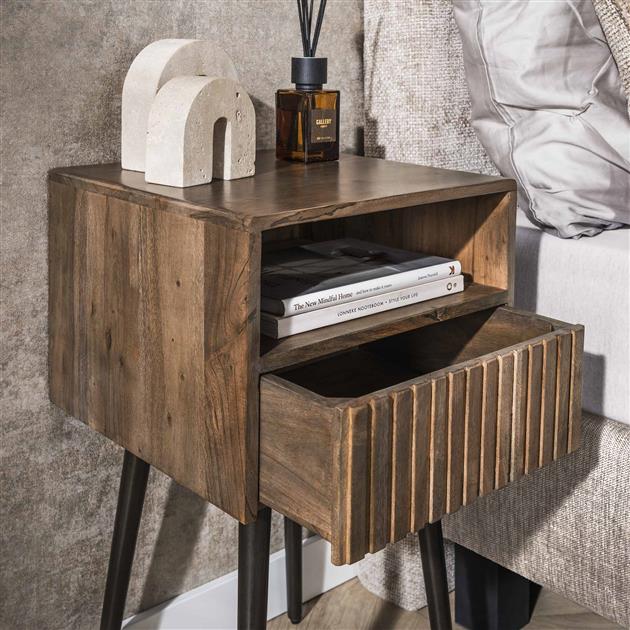 Het Nachtkastje Solvo in acaciahout van Bold Living is een stijlvolle en praktische toevoeging aan je slaapkamer. Vervaardigd uit hoogwaardig acaciahout, straalt dit nachtkastje warmte en natuurlijke charme uit. De prachtige nerven en kleurschakeringen van het hout maken elk exemplaar uniek en zorgen voor een rustige, sfeervolle uitstraling in de ruimte.