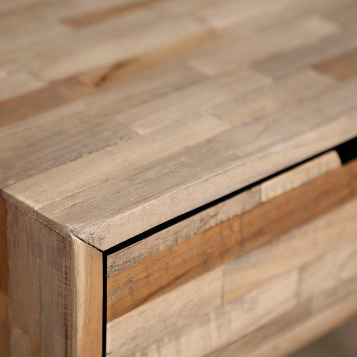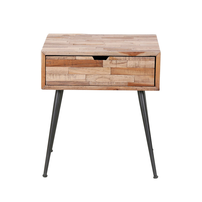 Dit unieke nachtkastje is gemaakt van verweerd teakhout. Het kastje heeft een natuurlijk uiterlijk en geeft je kamer een trendy touch. De metalen poten lopen lichtjes naar buiten waardoor het kastje stevig staat.