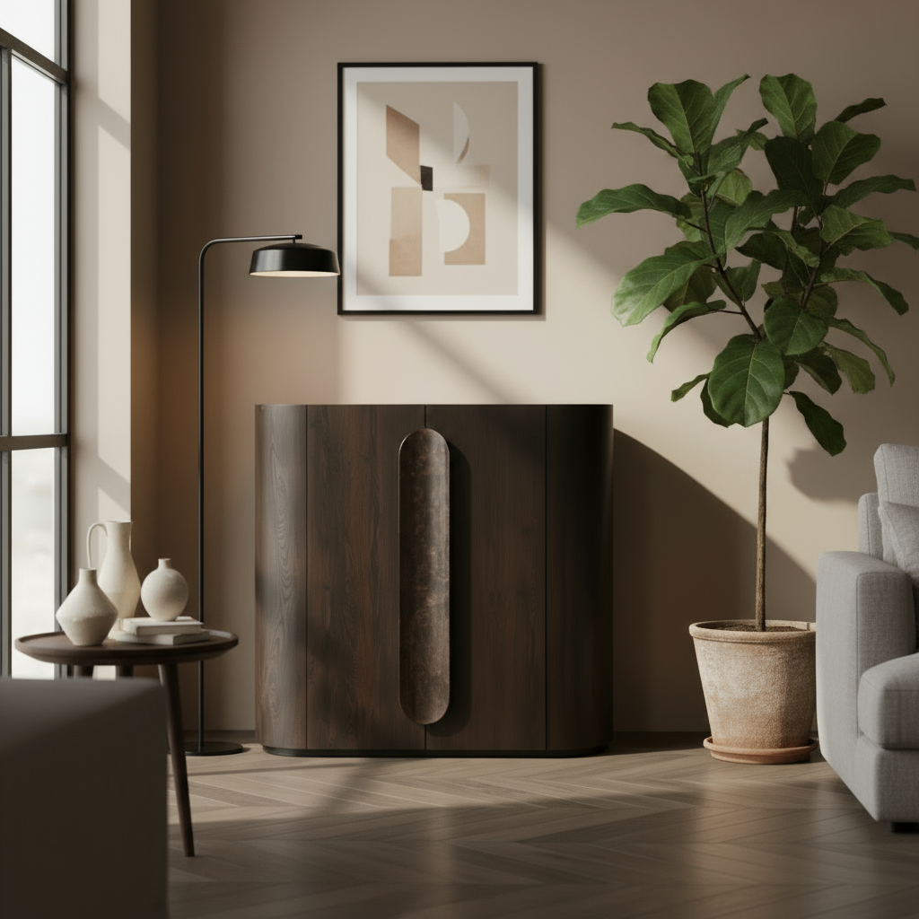 De Opbergkast Allure in donkerbruin van Towerliving combineert moderne luxe met subtiele elegantie. Het design valt direct op door de afgeronde hoeken, de diepe houtkleur en de karakteristieke verticale handgreep in bronskleurige finish. Deze verfijnde details geven het meubel een stijlvolle, eigentijdse uitstraling die perfect past binnen moderne, industriële of chique interieurs.
