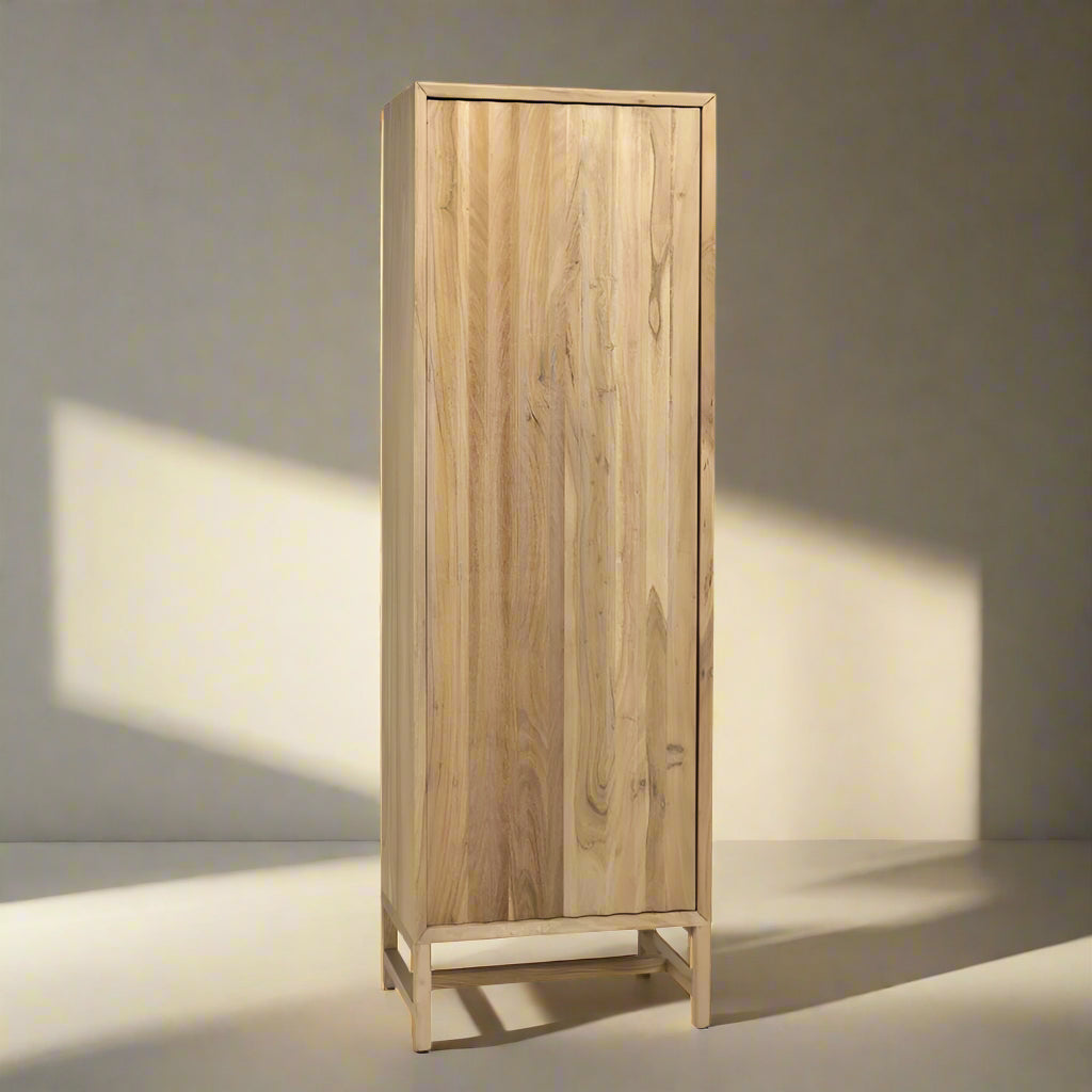 De Crotone Opbergkast | Naturel Acaciahout van Tower Living combineert praktische bergruimte met een uitgesproken, natuurlijke uitstraling. Vervaardigd uit massief acaciahout in een naturel afwerking, toont deze kast prachtig de unieke nerfstructuren en warme kleurschakeringen van het hout. De kast is voorzien van een linksdraaiende deur, wat zorgt voor functioneel gemak bij het plaatsen in diverse ruimtes.