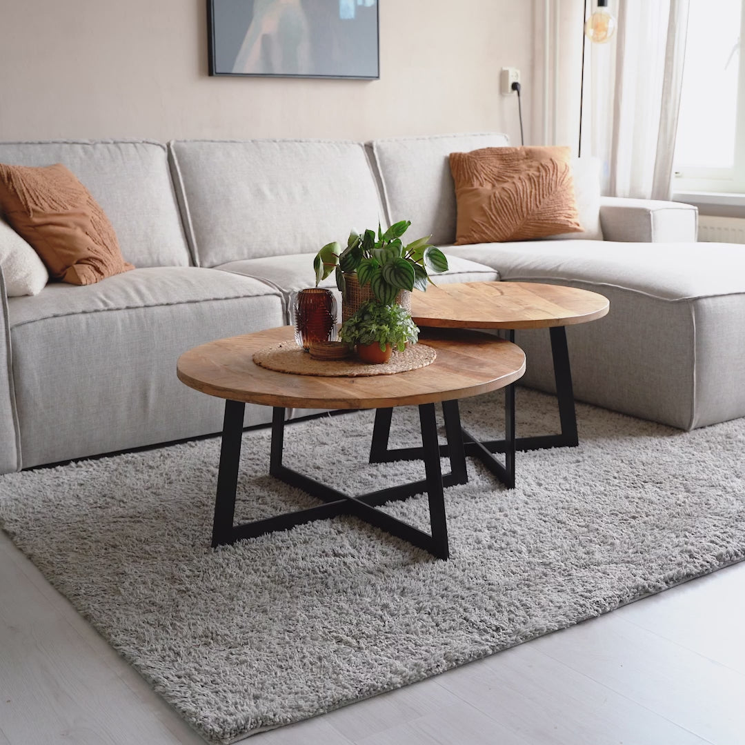 Deze mooie ronde mangohouten salontafelset is een mooi design voor in de woonkamer. Het metalen frame in combinatie met het robuuste mangohout vormen een trendy samenstelling die makkelijk combineert met andere meubels.