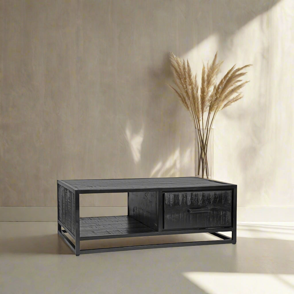 Maak kennis met de LABEL51 Salontafel Chili, een stijlvolle toevoeging aan uw interieur. Deze rechthoekige salontafel is vervaardigd uit zwart mangohout en heeft een stevig metalen frame, wat zorgt voor een robuuste en industriële uitstraling. Met afmetingen van 110x70x40 cm biedt deze tafel voldoende ruimte voor uw woonaccessoires.