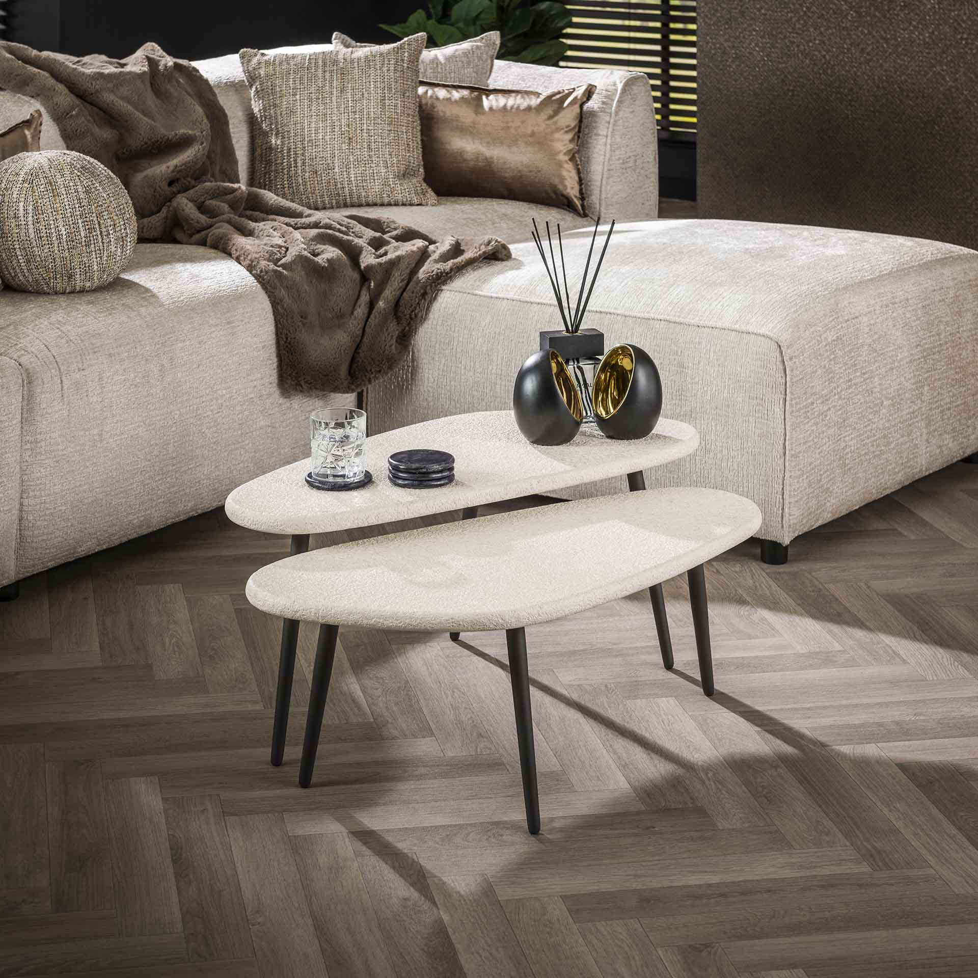 Maak kennis met de Salontafel Chloe. Deze moderne set organische salontafels is gemaakt van marmer composiet met stalen poten. Het tafelblad heeft een prachtige afwerking die een unieke uitstraling geeft. Je kunt de tafels op een speelse manier naar eigen voorkeur bij elkaar zetten.