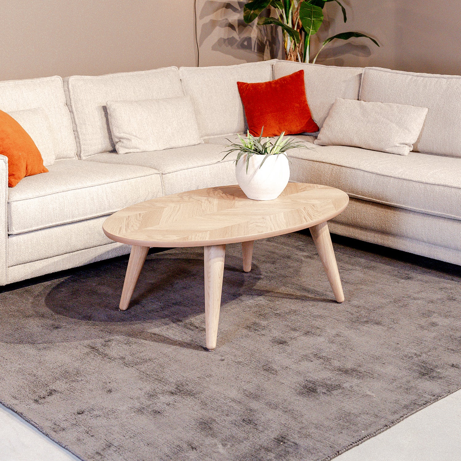 Maak kennis met onze trendy en praktische Salontafel Ines in Naturel Eikenhout. Met zijn ovale vorm en naturel eikenfineer is deze eiken salontafel een strak en stijlvol meubelstuk dat perfect past in een modern en minimalistisch interieur. Het vissengraatpatroon op het tafelblad geeft een elegant tintje, terwijl de kegelvormige hoge poten met een speels accent naar binnen staan.
