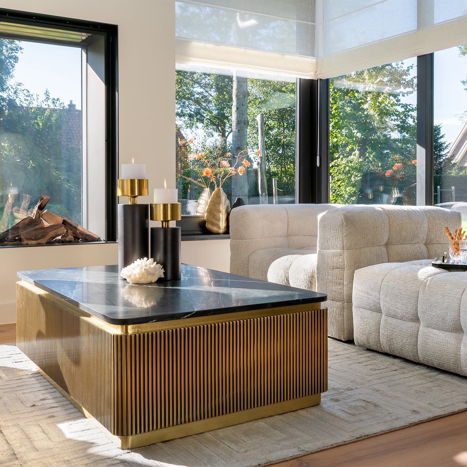 Maak kennis met de Salontafel Ironville in het goud met zwart marmer, een absolute eyecatcher voor jouw interieur. Deze salontafel combineert elegantie en moderniteit met zijn vierkante vorm en prachtige zwarte en gouden details.