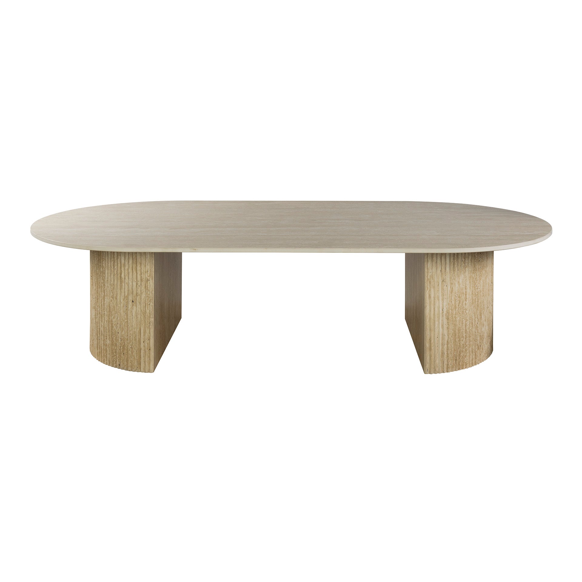 De salontafel Lucent – keramiek travertin is een elegante mix van natuurlijke luxe en modern design. Het ovale blad, uitgevoerd in keramiek met een realistische travertinlook, straalt rust en verfijning uit. De unieke combinatie van een geribde, ronde poot en een vlakke rechte poot maakt deze tafel niet alleen stijlvol, maar ook sculpturaal in vorm.