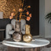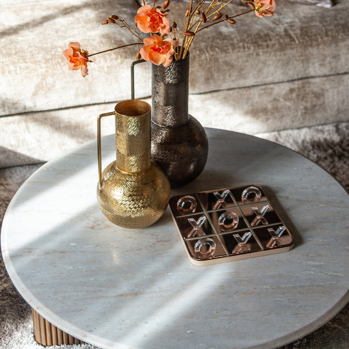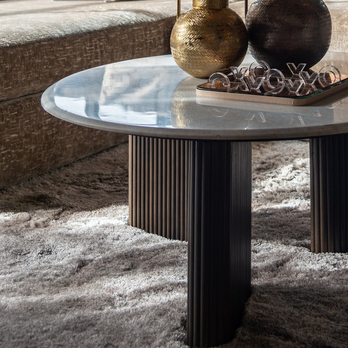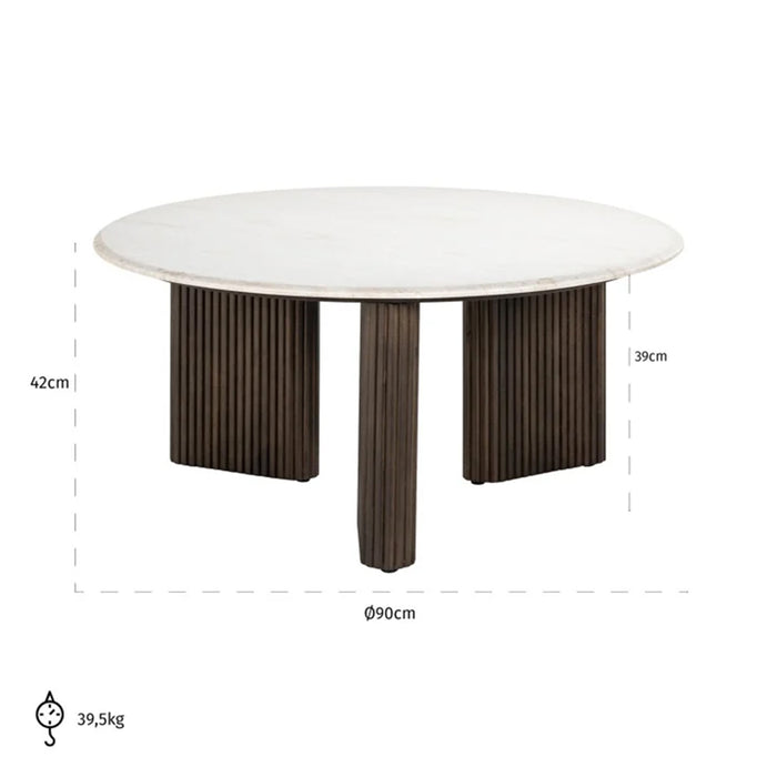 De drie langwerpige poten van latjes geven de marmeren salontafel een uniek en eigentijds karakter. Het contrast tussen het robuuste mangohout en het delicate marmer zorgt voor een harmonieuze balans die een visueel statement maakt in elke kamer.