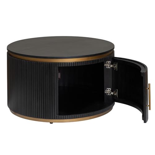 Deze salontafel straalt elegantie uit met zijn zwart afgewerkte mangohout en de subtiele brass accenten. Dit mangohouten salontafel, geïnspireerd op hotel chique design, biedt niet alleen ruime opbergruimte maar ook een verfijnde uitstraling aan jouw eetkamer of woonkamer.