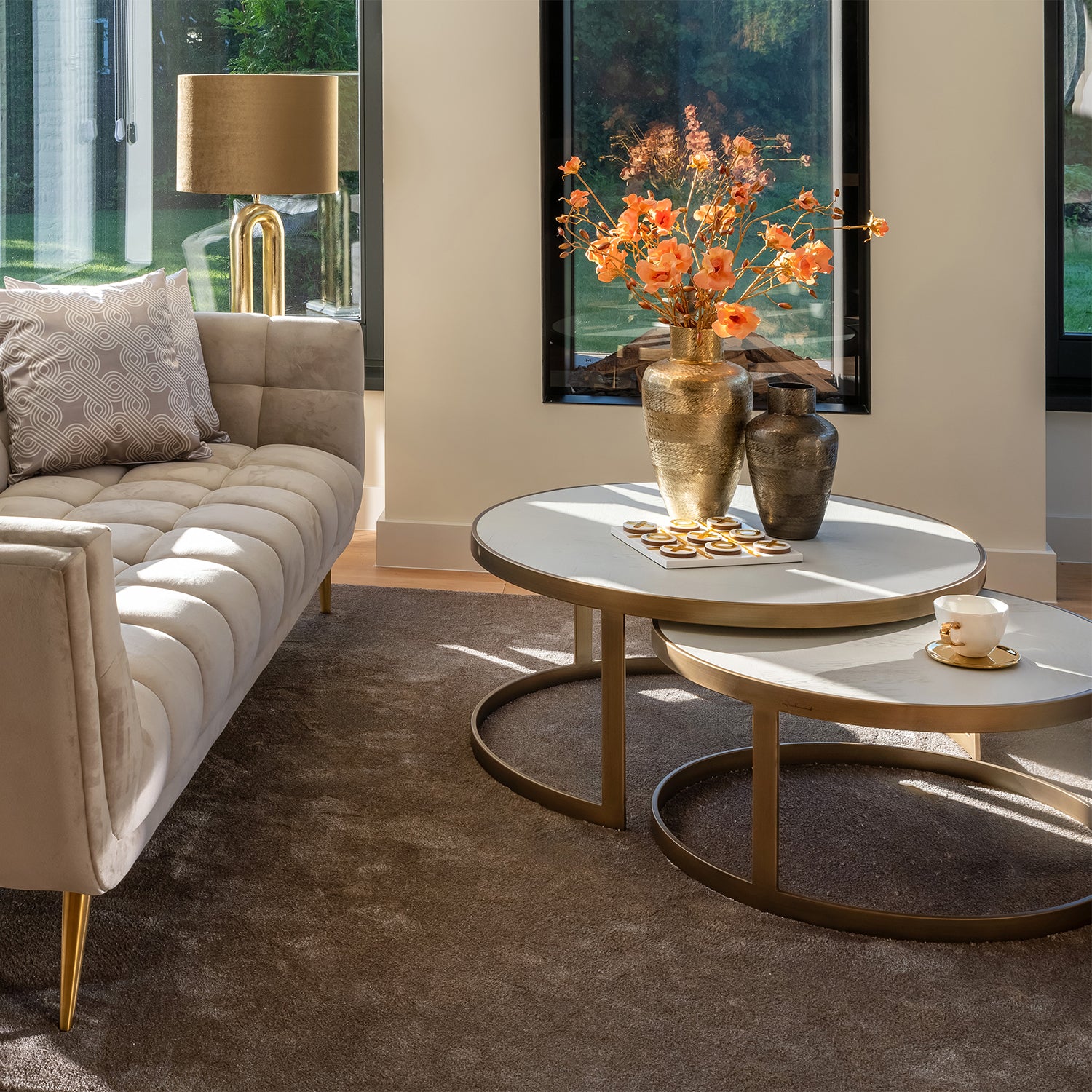 Verrijk je woonruimte met de Salontafel Whitebone, een prachtige set van twee salontafels die functionaliteit combineert met stijlvol design. Deze set, met een verfijnd wit blad en een elegant brassen frame, voegt een vleugje luxe toe aan elke woonkamer.