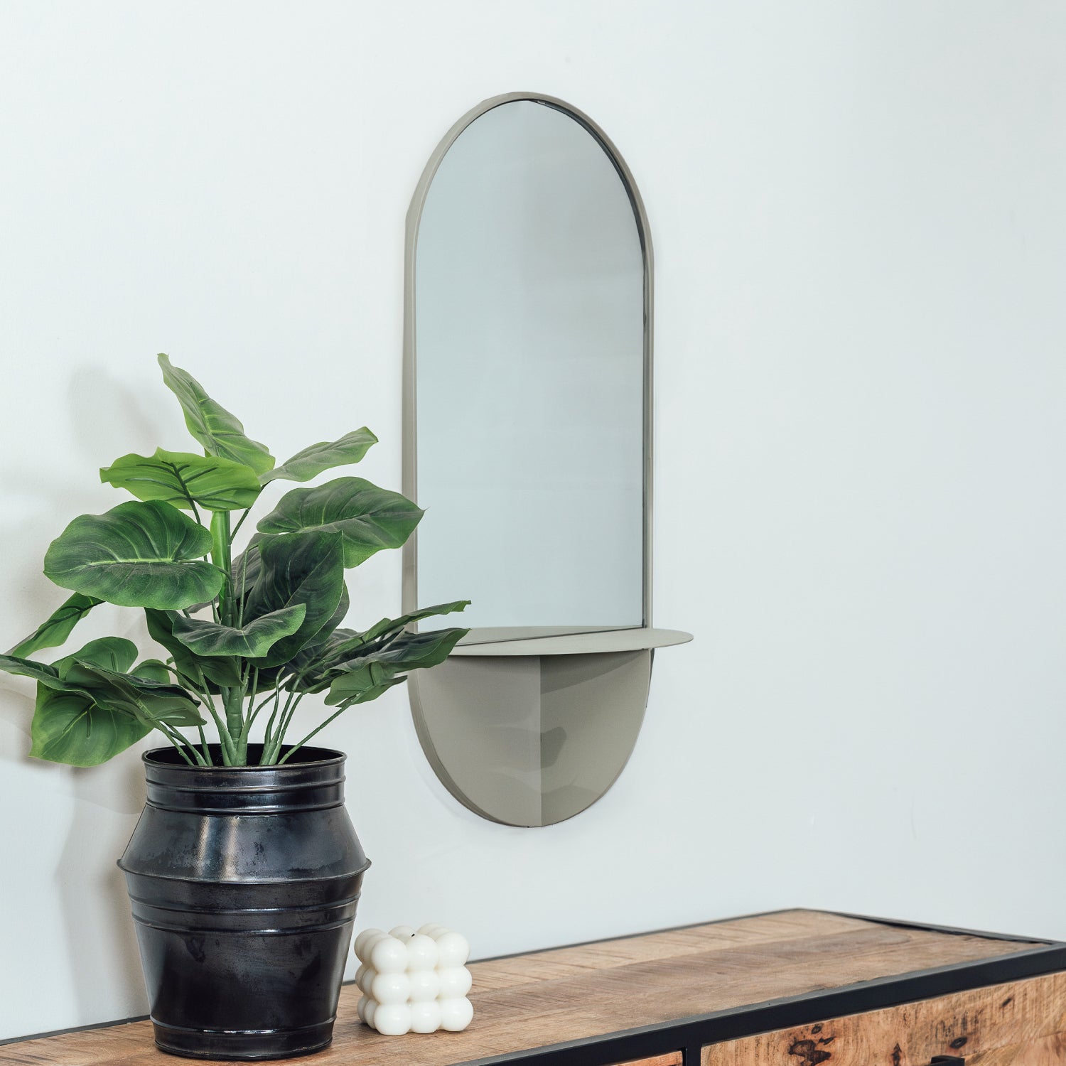 De combinatie van een ovaal design en de robuuste metalen omlijsting zorgt voor een eigentijdse uitstraling die gemakkelijk te integreren is in zowel kleine als grote ruimtes. De zachte taupe kleur zorgt ervoor dat de spiegel subtiel en stijlvol blijft, zonder te overheersen. Het geïntegreerde plankje biedt een praktische oplossing voor mensen die graag extra opbergruimte willen zonder in te leveren op design.