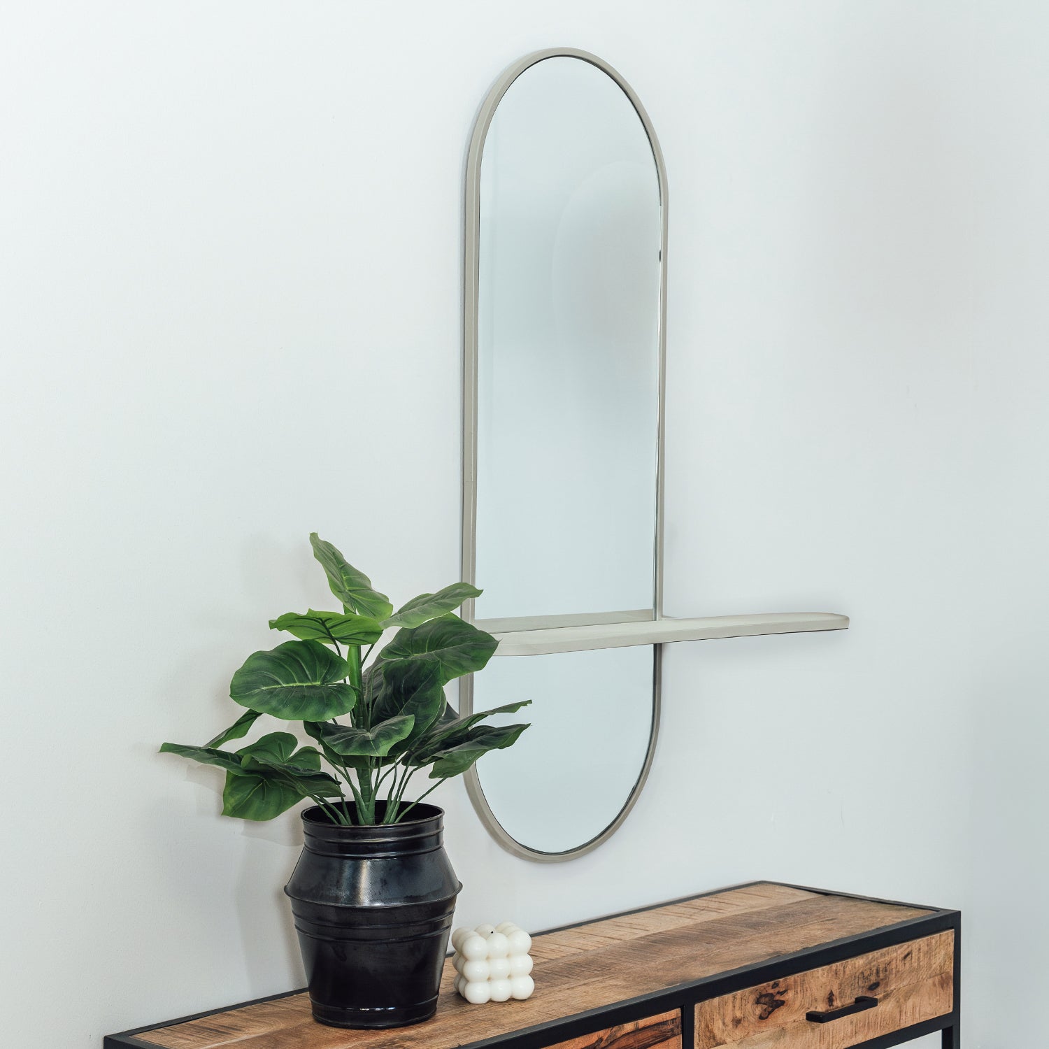 De combinatie van een ovaal design en de robuuste metalen omlijsting zorgt voor een eigentijdse uitstraling die gemakkelijk te integreren is in zowel kleine als grote ruimtes. De zachte taupe kleur zorgt ervoor dat de spiegel subtiel en stijlvol blijft, zonder te overheersen. Het geïntegreerde plankje biedt een praktische oplossing voor mensen die graag extra opbergruimte willen zonder in te leveren op design.