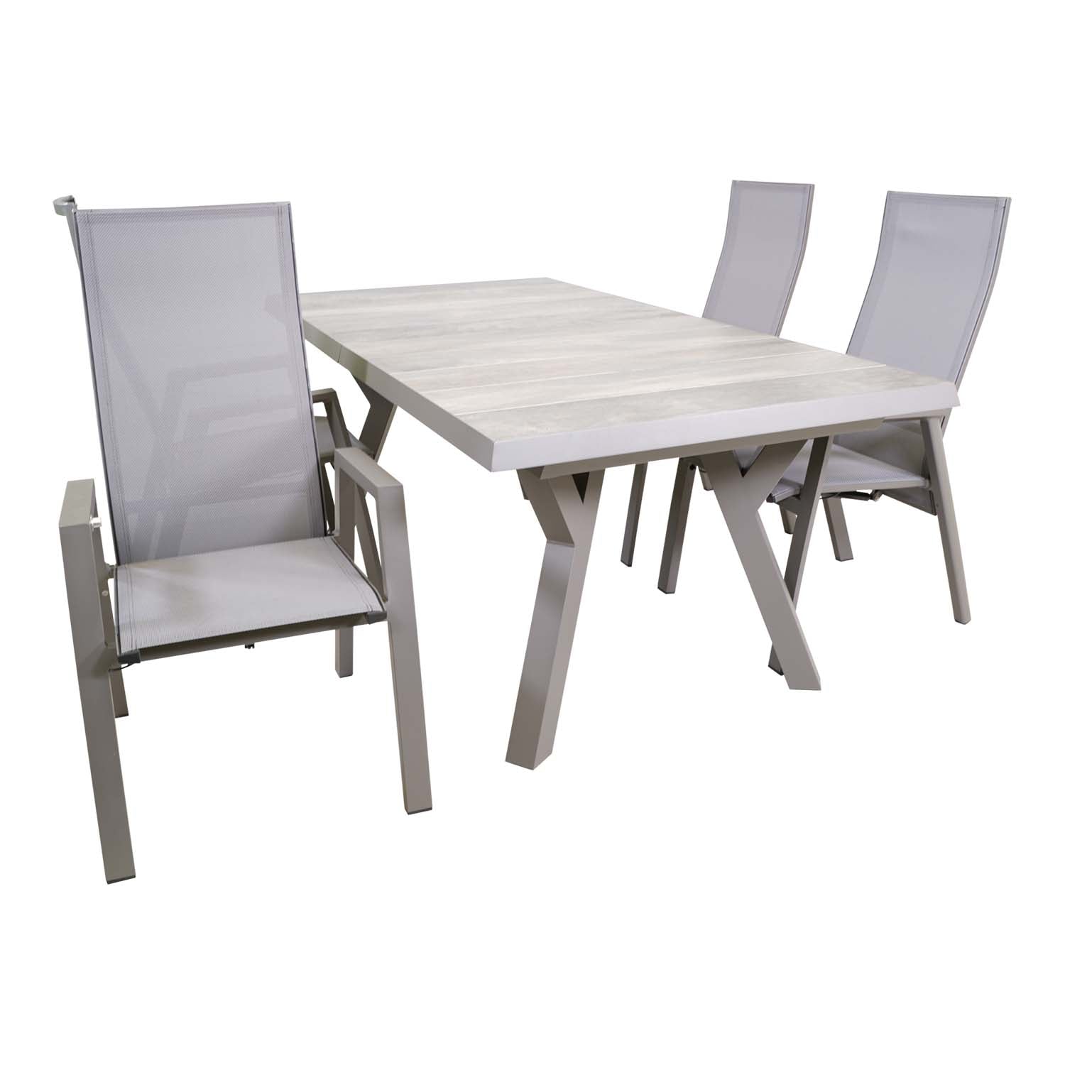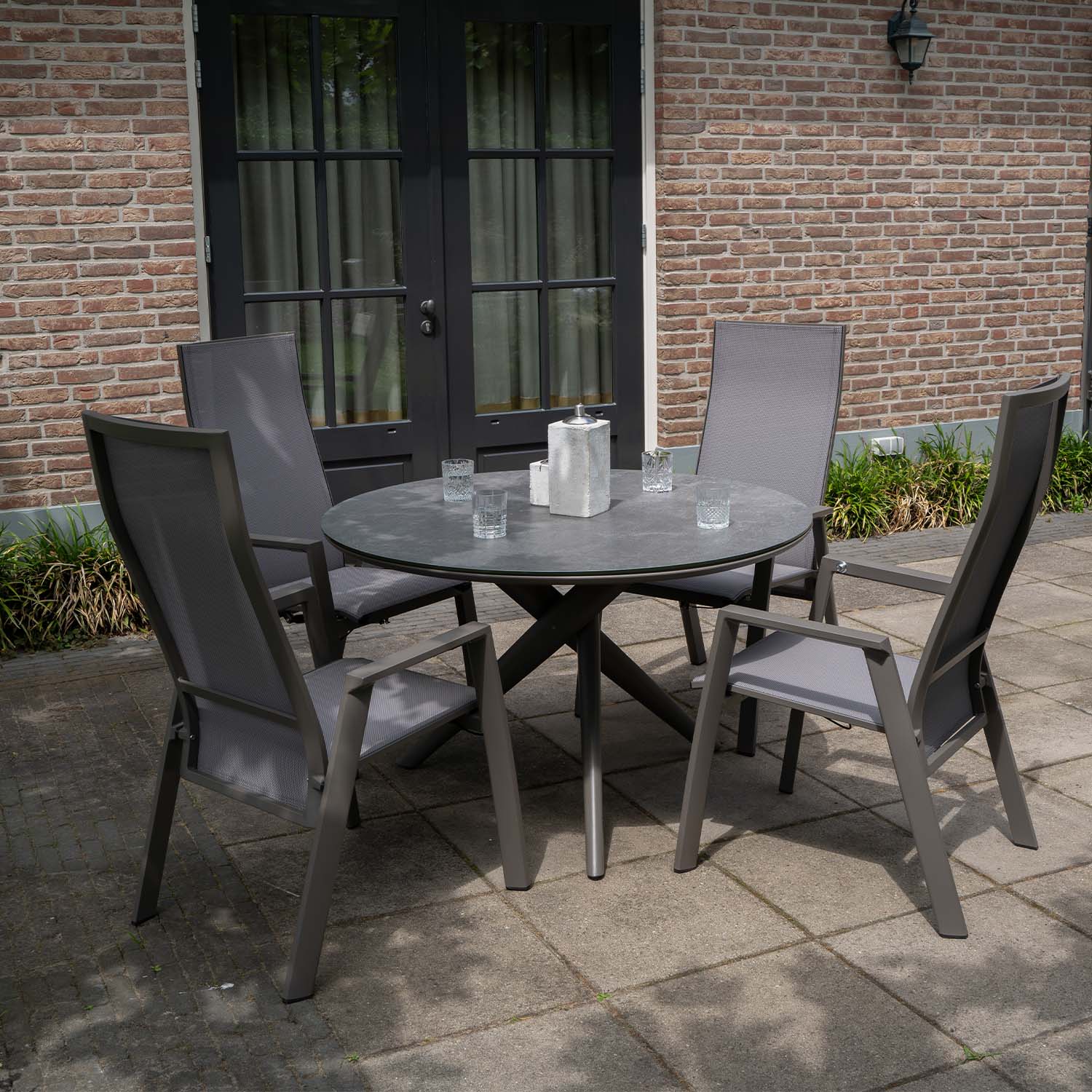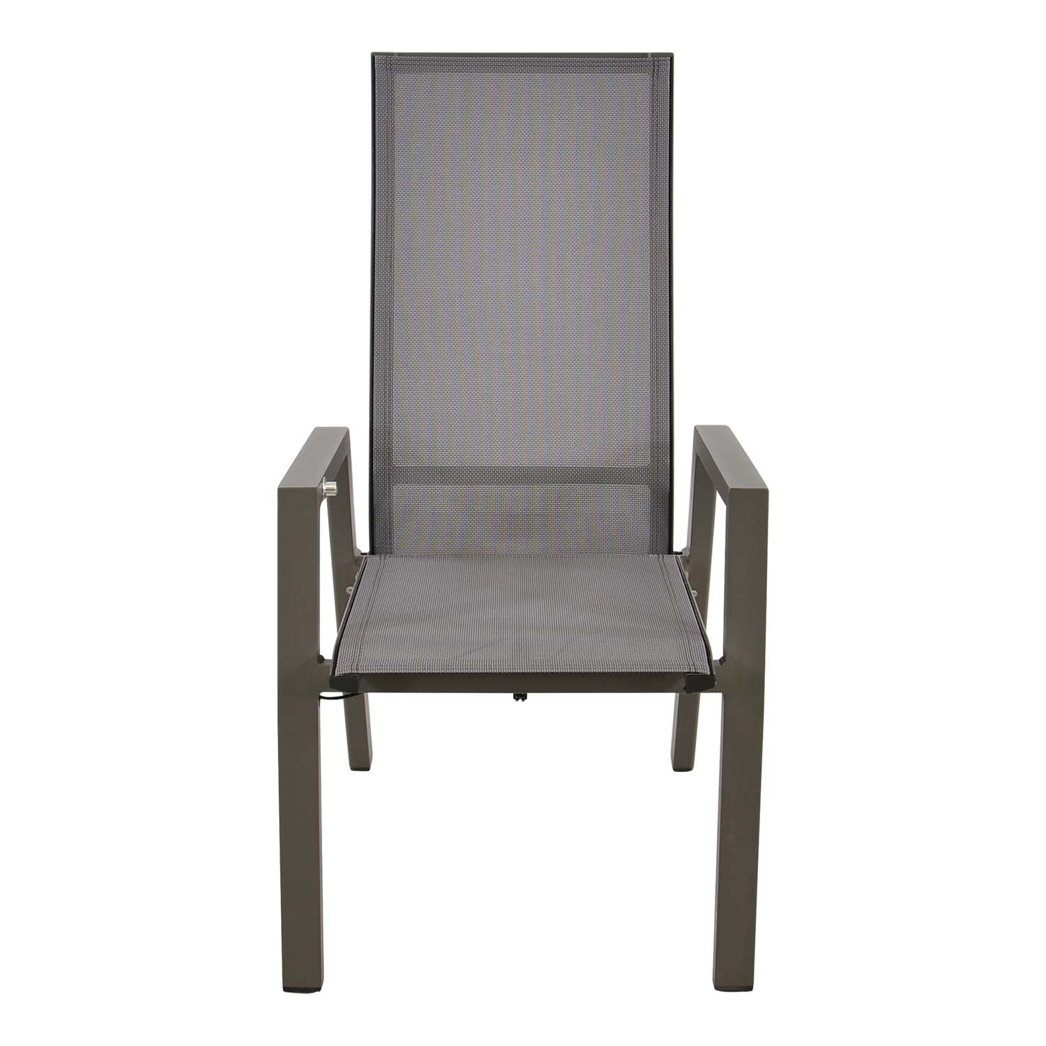 Dit tuinmeubel is voorzien van een hoogwaardig beige-grijs textilene zit- en rugvlak, wat zorgt voor extra comfort en duurzaamheid. De rugleuning is traploos verstelbaar door een gasdrukveer, zodat je altijd de perfecte zitpositie kunt vinden. De armleuningen voegen een luxe uitstraling toe en zorgen voor extra comfort.