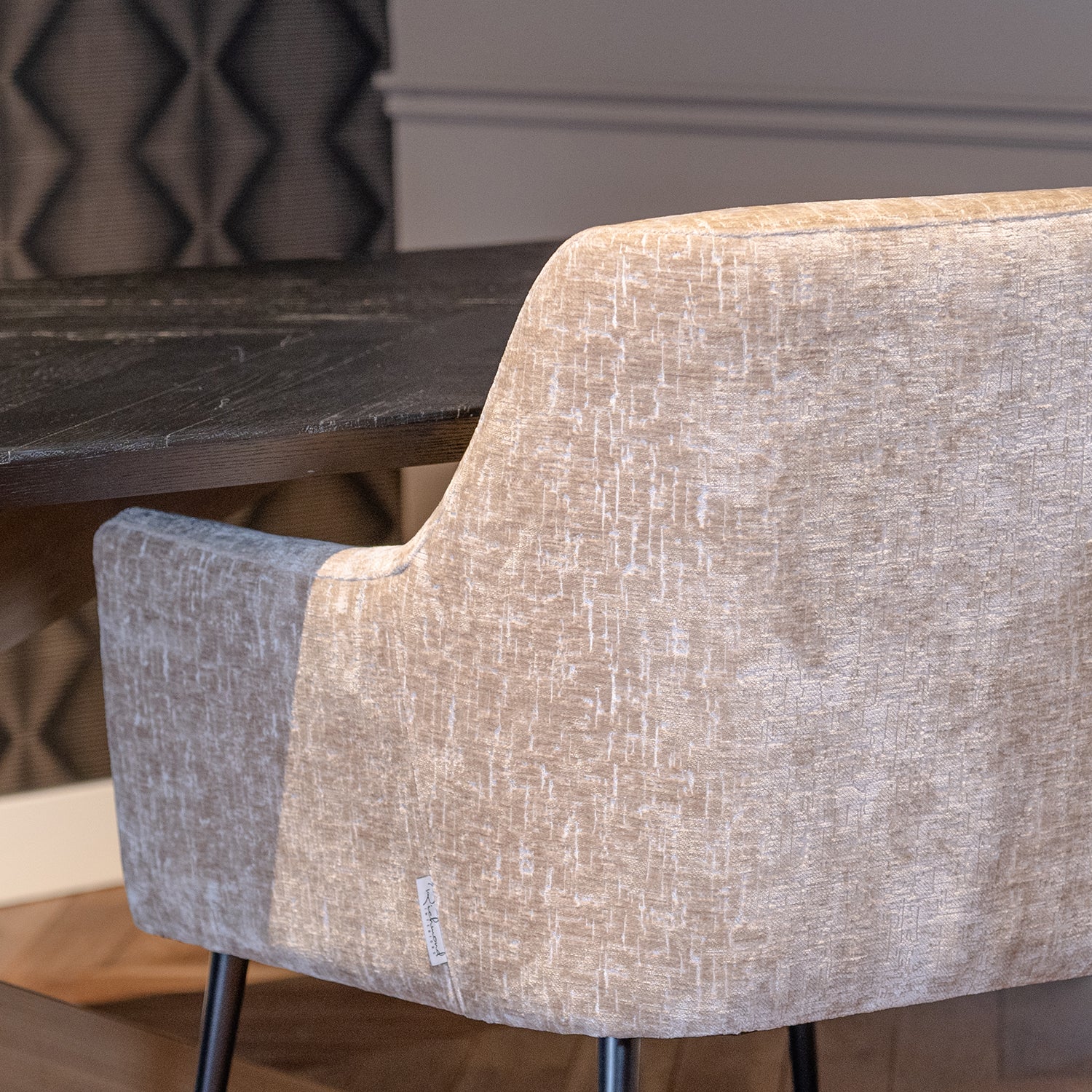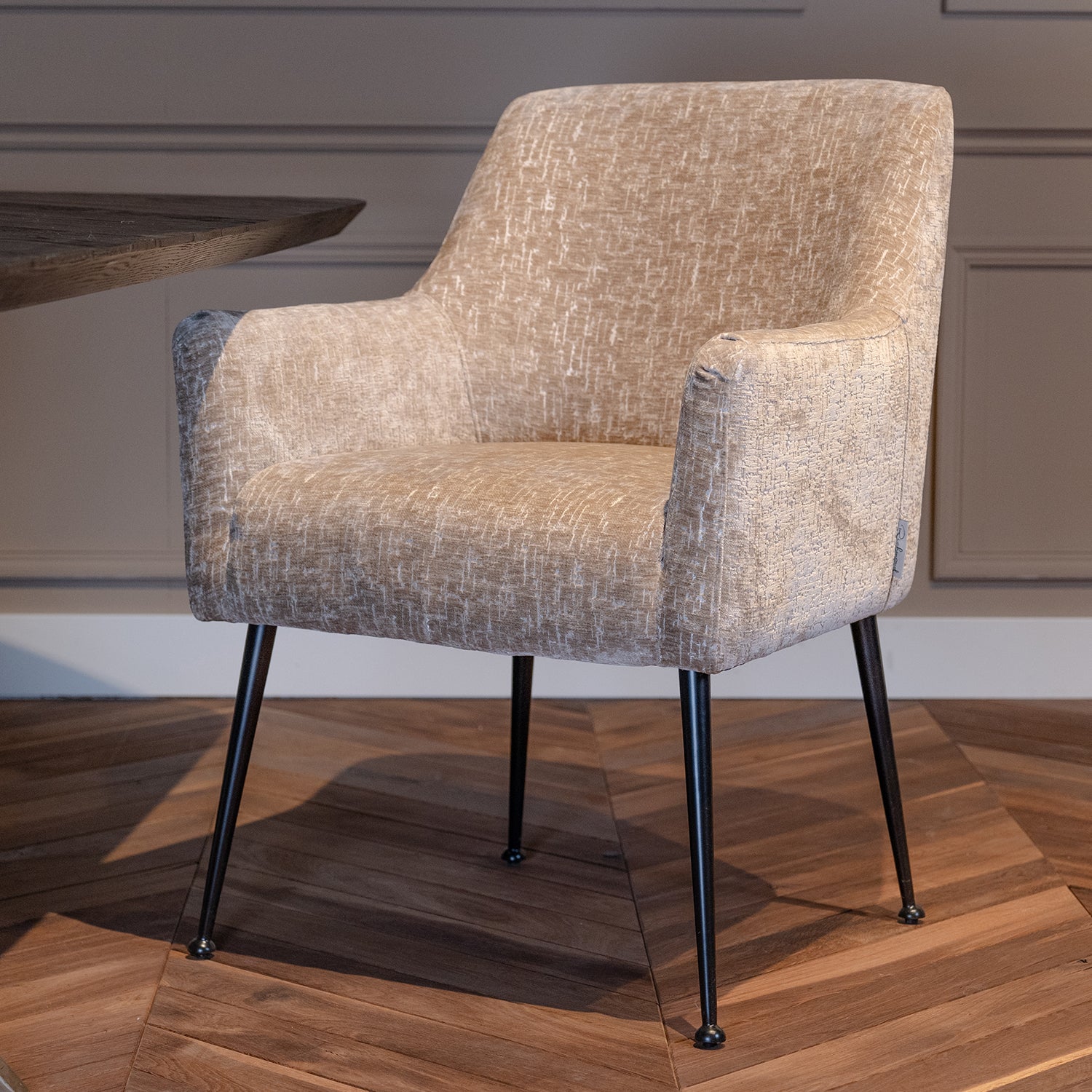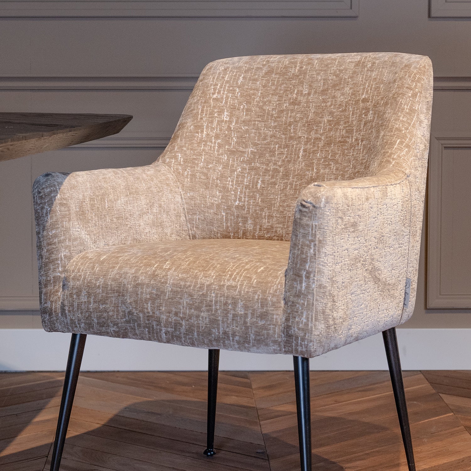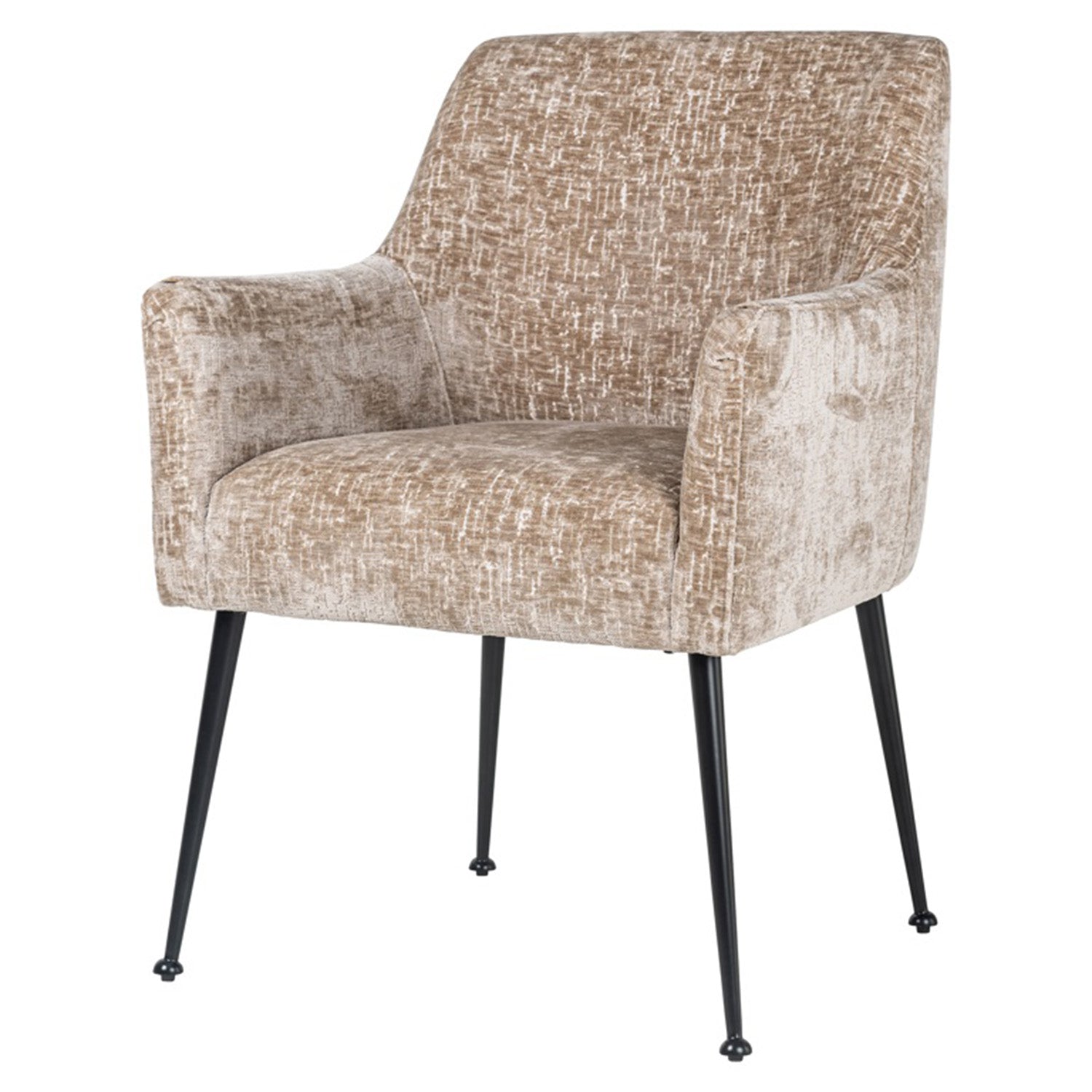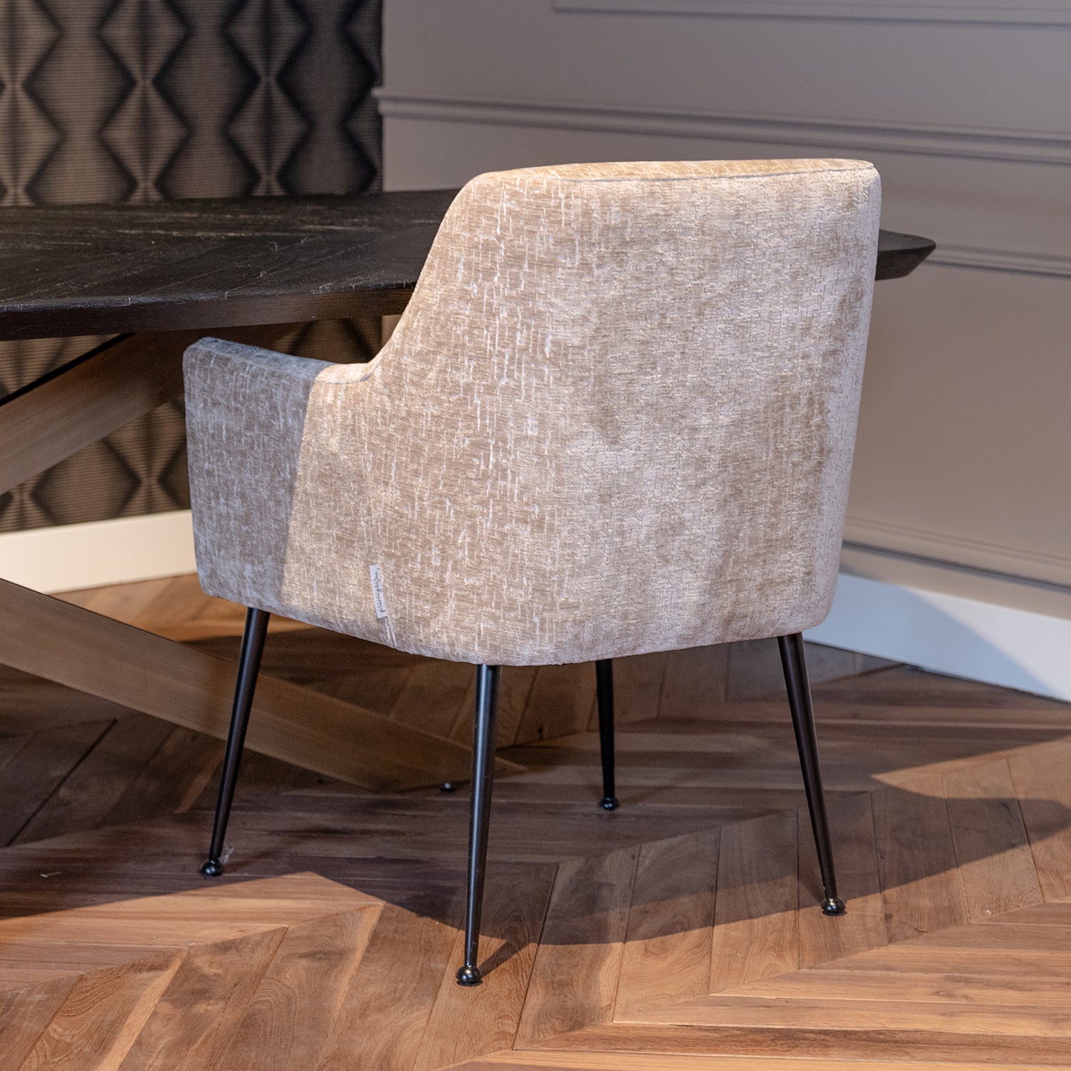 De Eetkamerstoel Harley in de kleur Shitake Island is gestoffeerd met een fijne dikke stof en heeft poten van zwart metaal. De eetkamerstoel heeft armleuningen voor een comfortabele zitting.