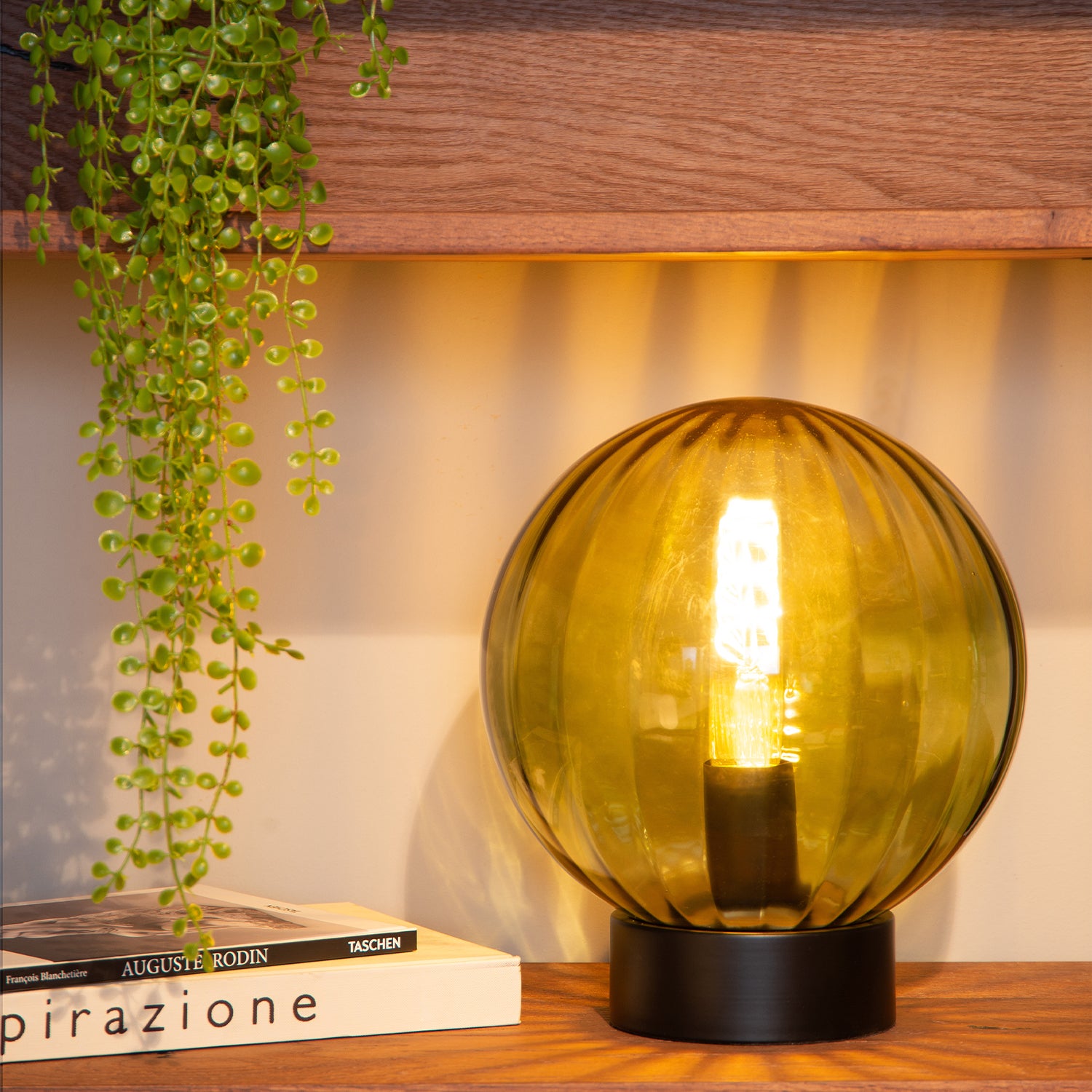 Maak kennis met de Tafellamp Monsaraz in Groen. De lamp is geïnspireerd door de magie van zeepbellen. Deze lamp vangt de speelse reflecties en kleurrijke schakeringen van licht in een elegant en stijlvol ontwerp. De lichtbron, bij voorkeur een filamentlamp, wordt omhuld door een luxueuze glazen bol. Het subtiele reliëf in het glas versterkt de dynamische lichtspeling, waardoor Monsaraz een echte blikvanger is in elk interieur.