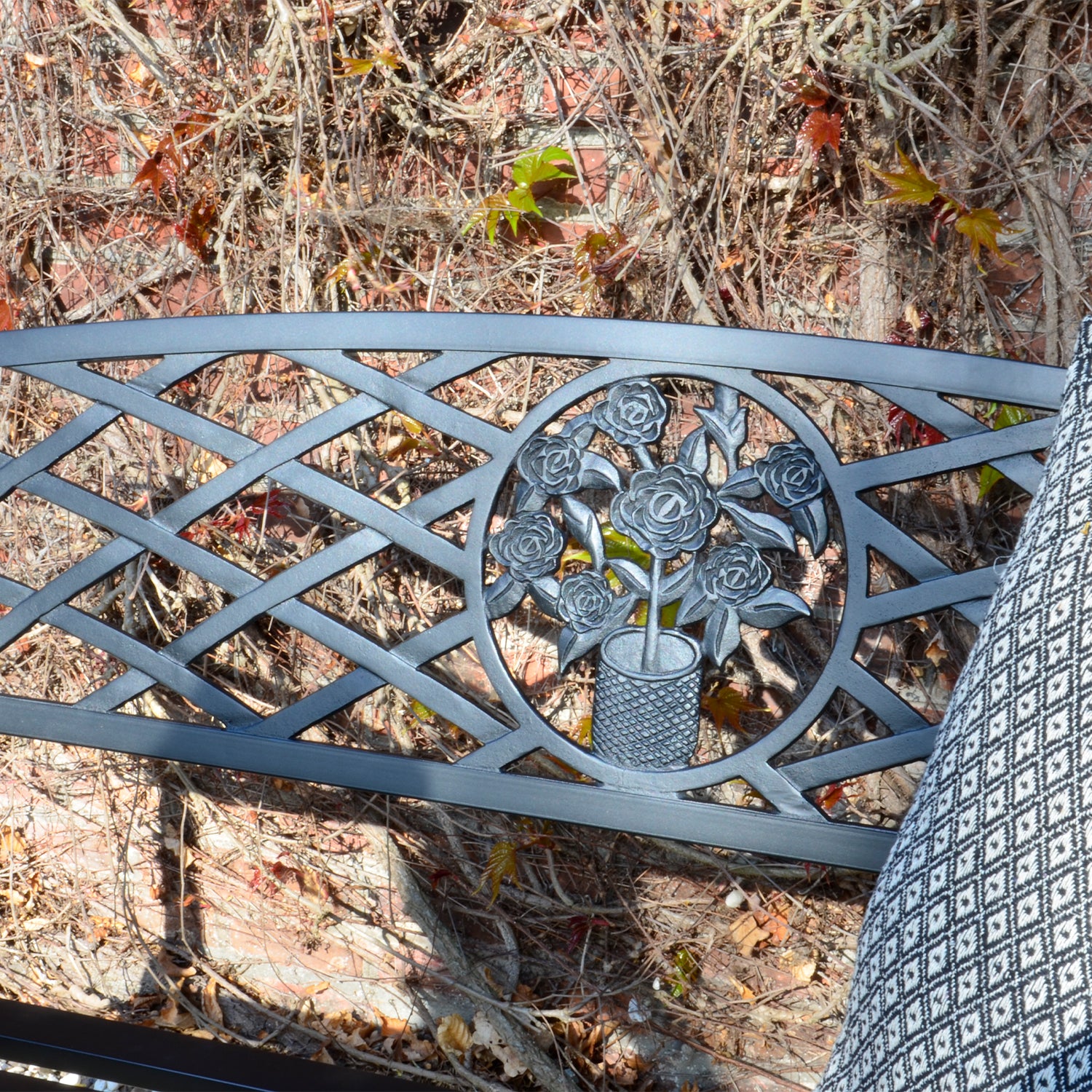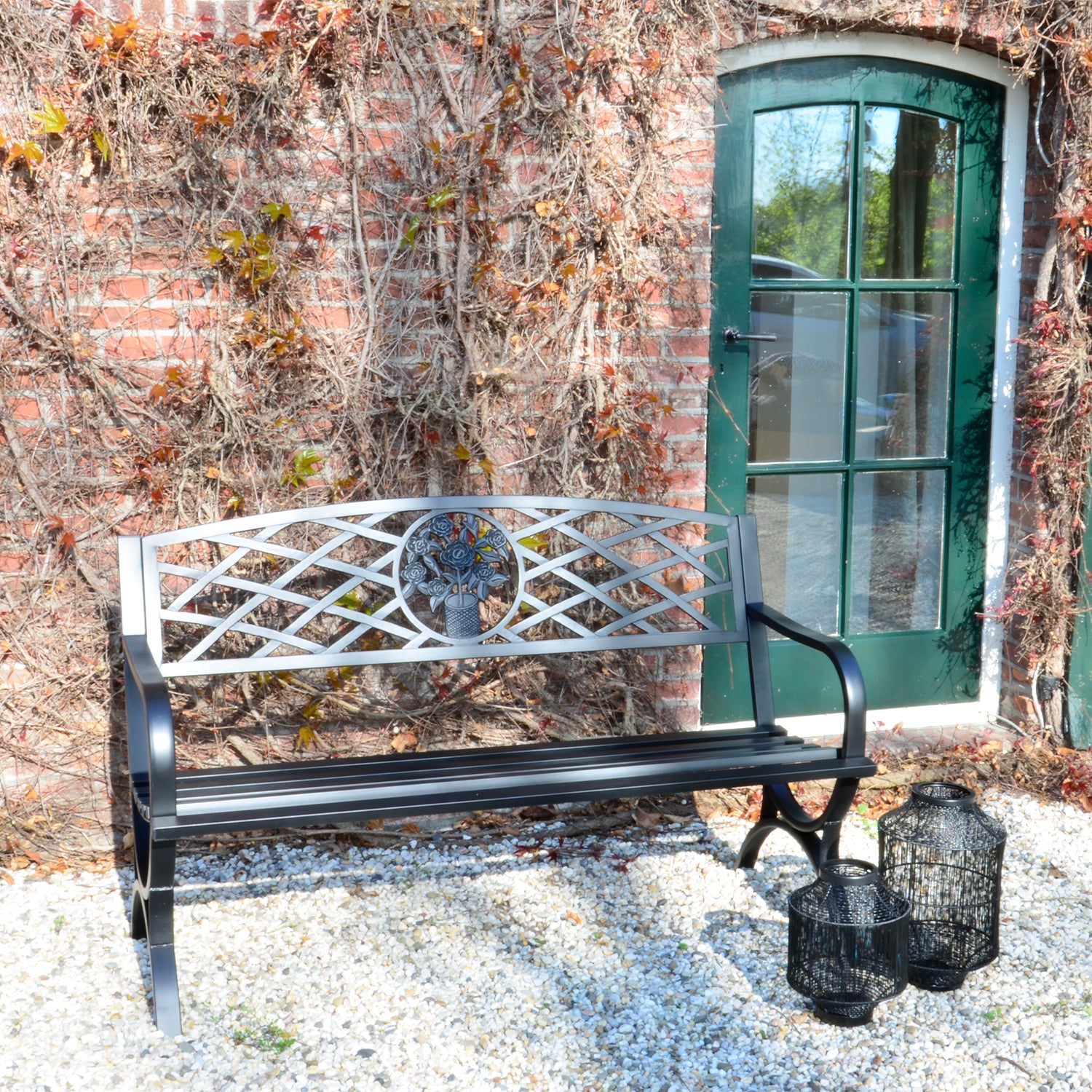 Het zwart metalen frame biedt stijl en stabiliteit, terwijl het gewicht van de tuinbank het gemakkelijk maakt om hem te verplaatsen naar je favoriete plekje in de tuin. Gemaakt van Zwart Metaal.