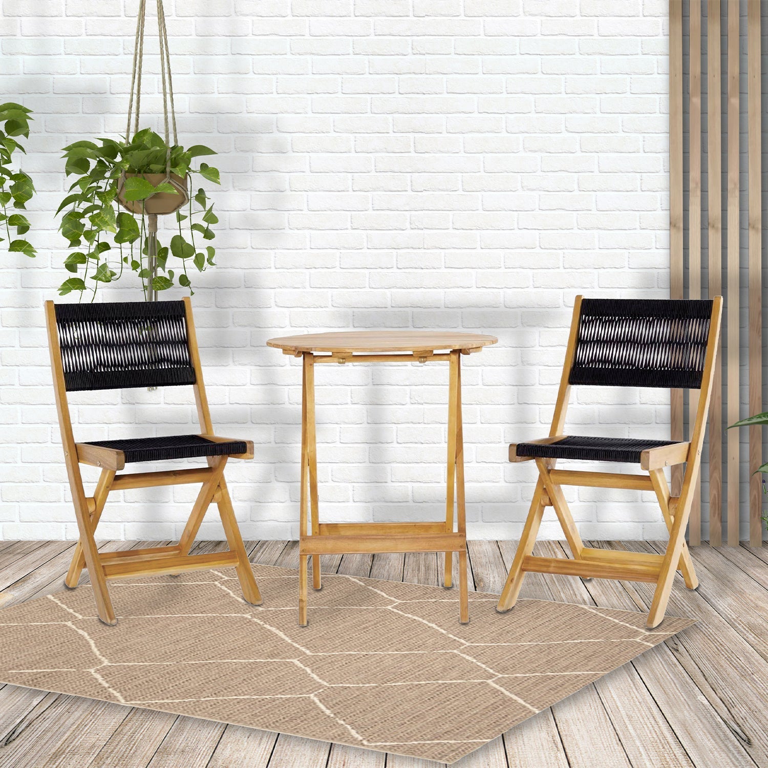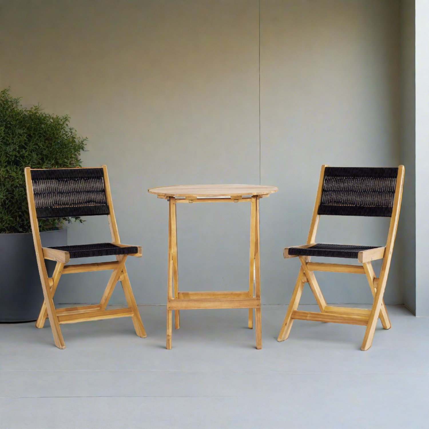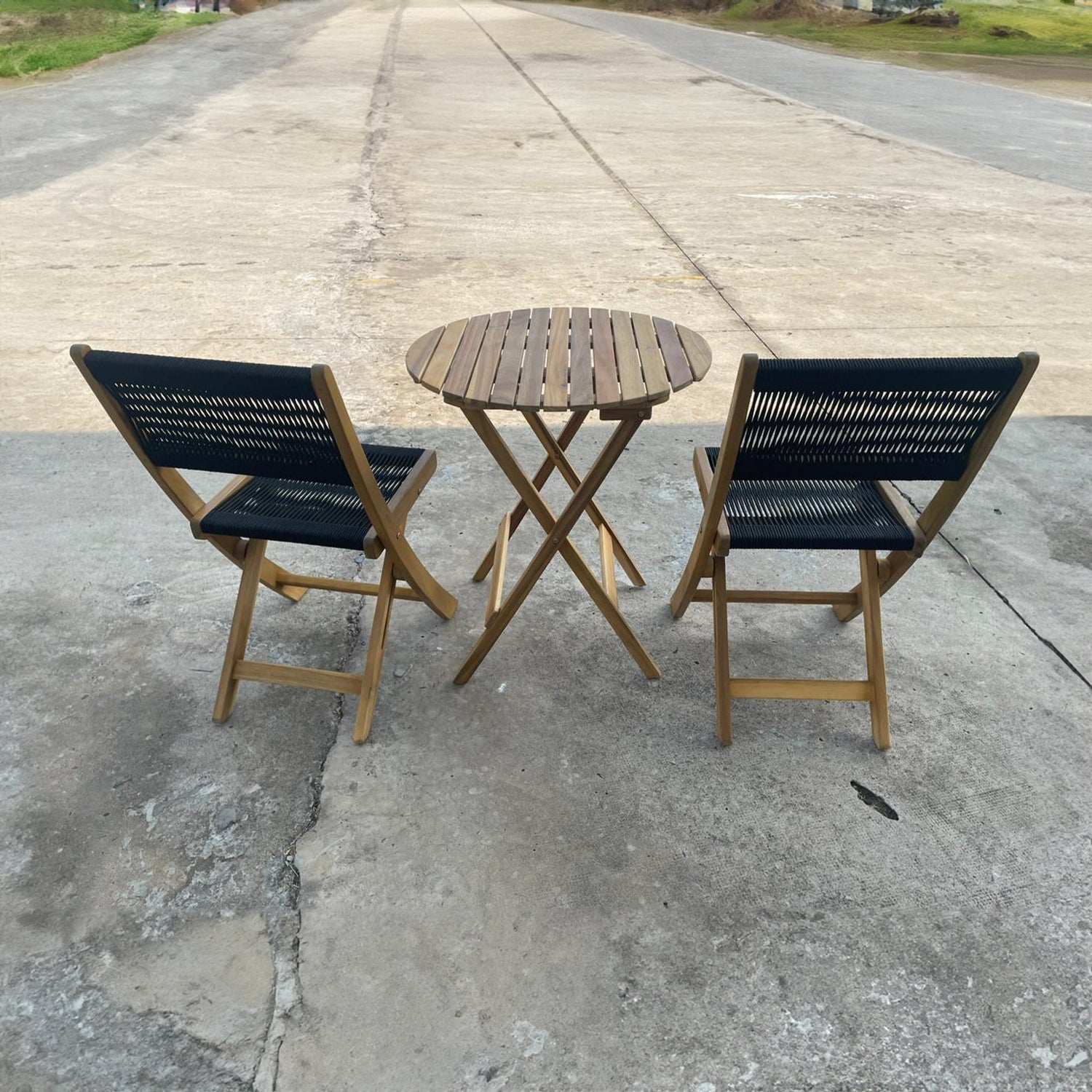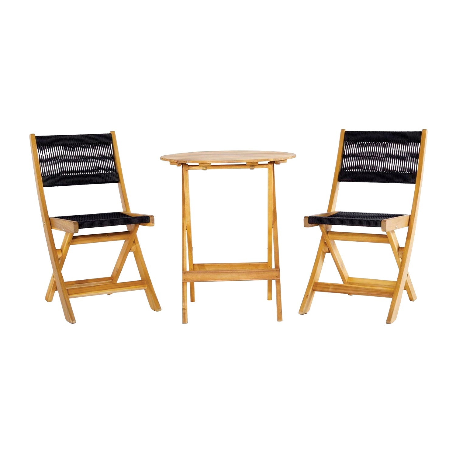 De stoelen van de Tuinset Lanzarote Bistro zijn ontworpen met comfort in gedachten. Het gespannen touw biedt een flexibele en ondersteunende zitting, terwijl het robuuste acaciahouten frame zorgt voor stabiliteit en duurzaamheid, zelfs bij langdurig buitengebruik.