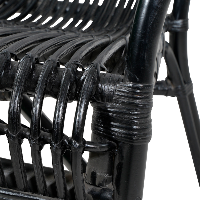 De loungestoel is vervaardigd met een stevig zwart frame van rotan, wat zorgt voor een stijlvolle en natuurlijke uitstraling. Rotan staat bekend om zijn duurzaamheid en flexibiliteit, waardoor het een perfect materiaal is voor buitenmeubilair. Het zwarte frame voegt een modern tintje toe aan het klassieke ontwerp, waardoor de stoel een eyecatcher is in elke tuin of op elk terras.