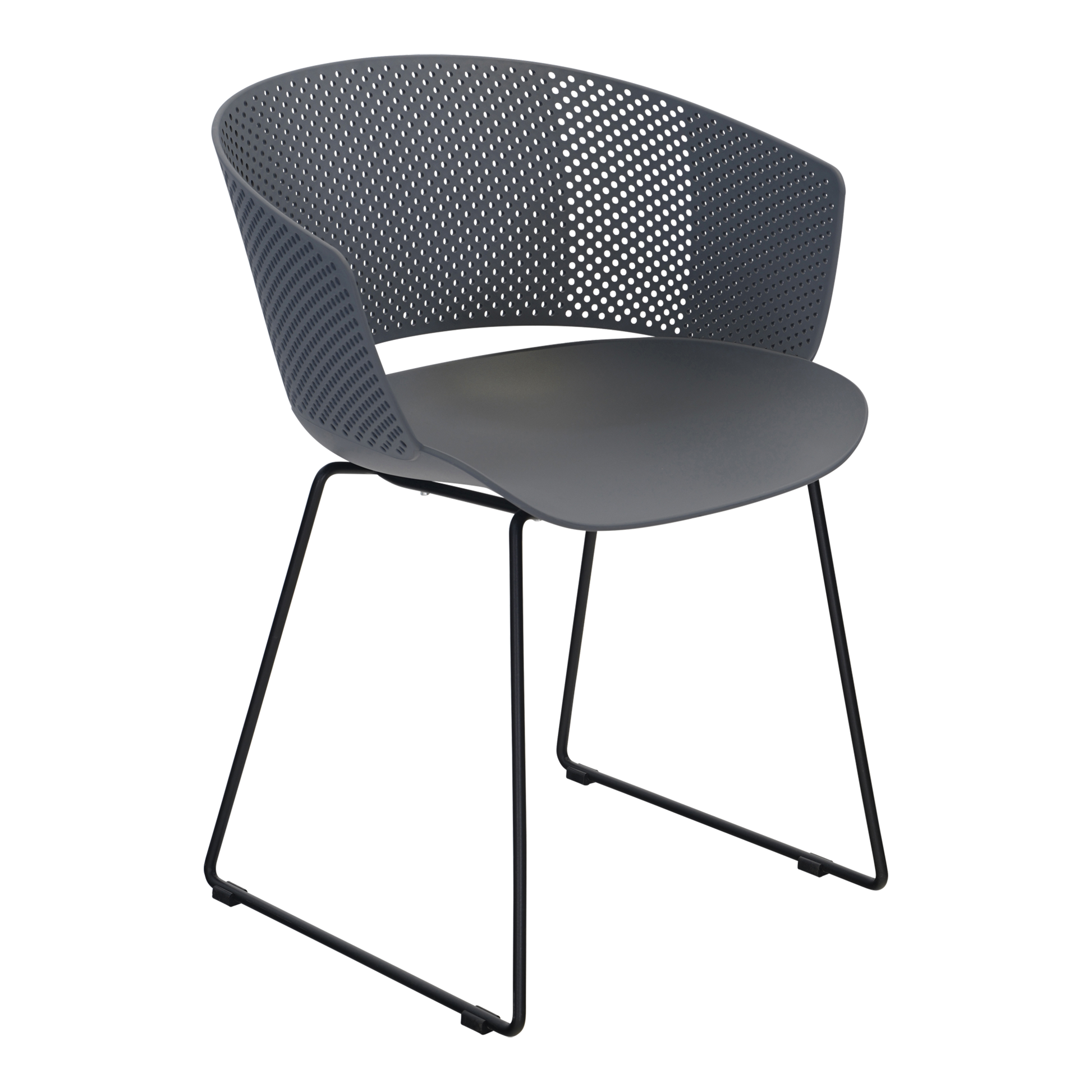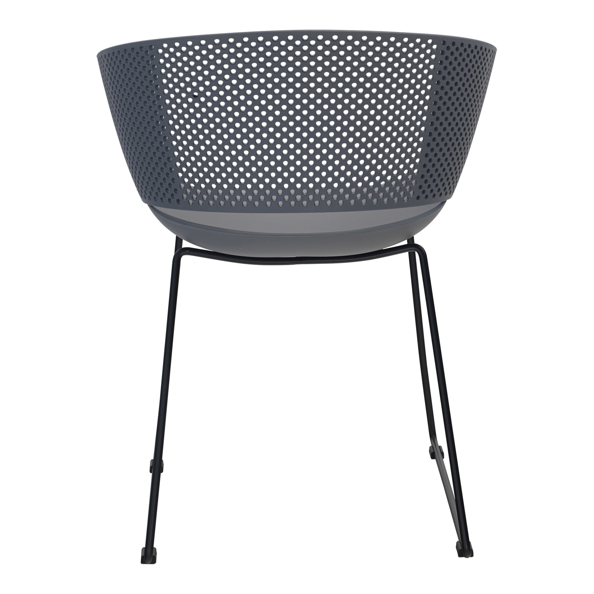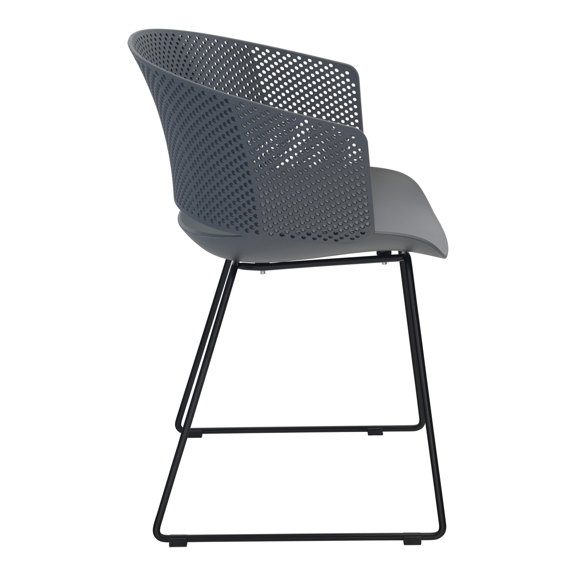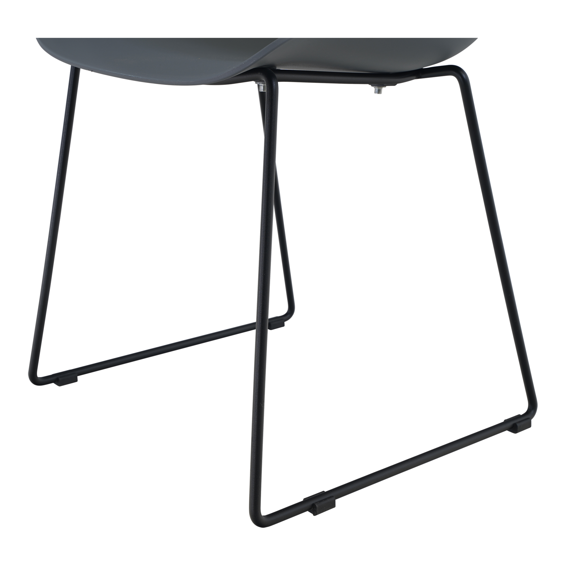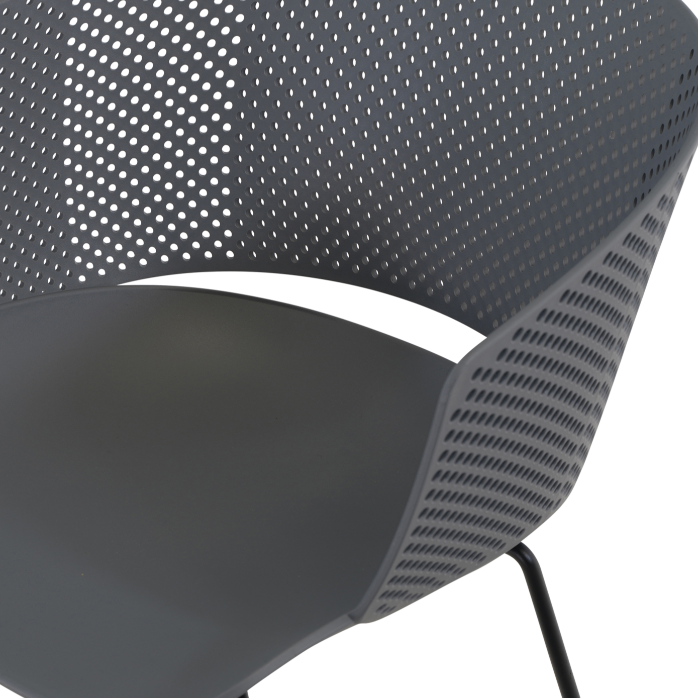 De stoel is verkrijgbaar in drie prachtige kleuren: grijs, zwart en wit. De zitting is gemaakt van hoogwaardig polypropyleen (PP) in grijs, wat zorgt voor een duurzame en weerbestendige zitervaring. De strakke, moderne uitstraling van de zitting wordt perfect gecomplementeerd door de matzwarte stalen poten, die een stevige en stabiele basis bieden.