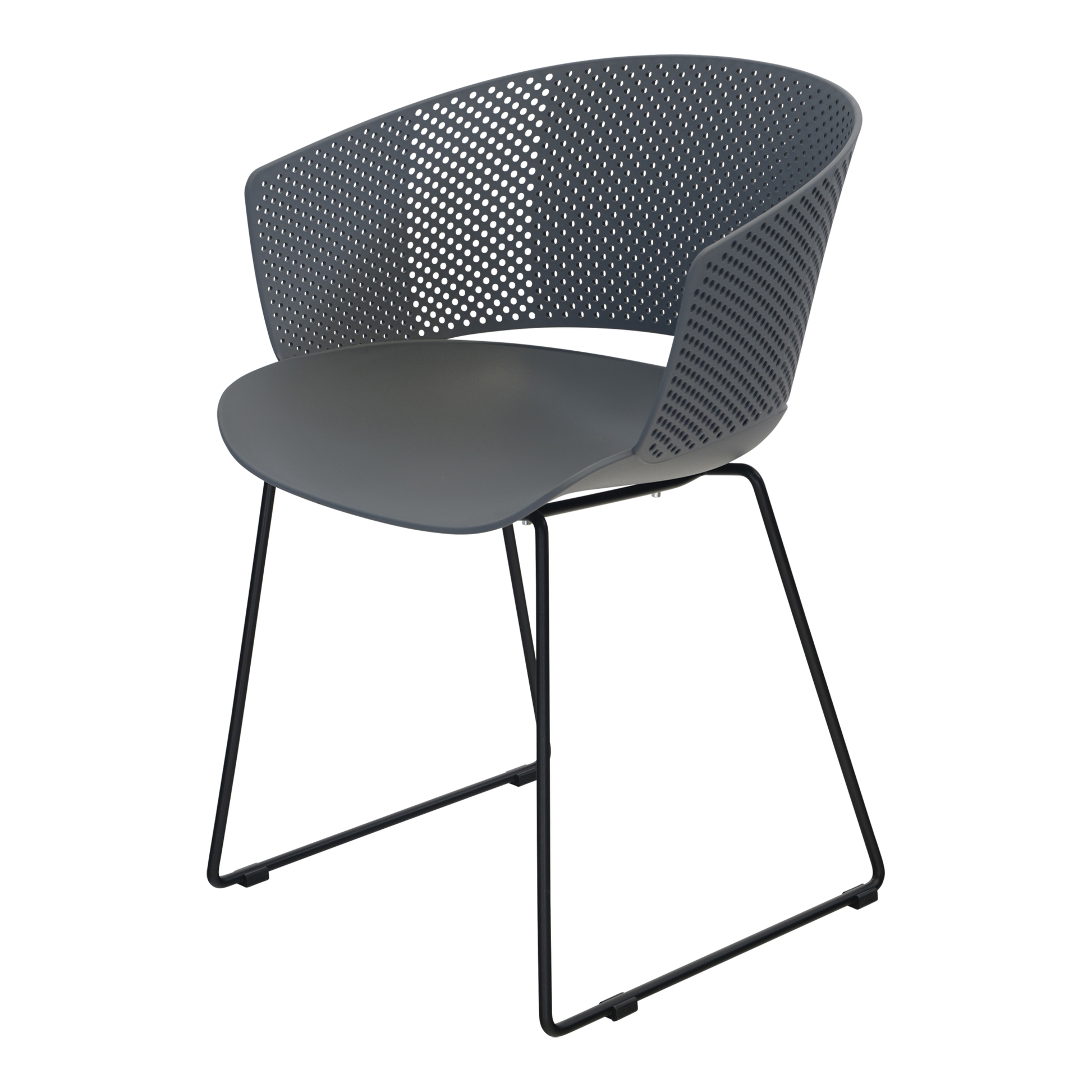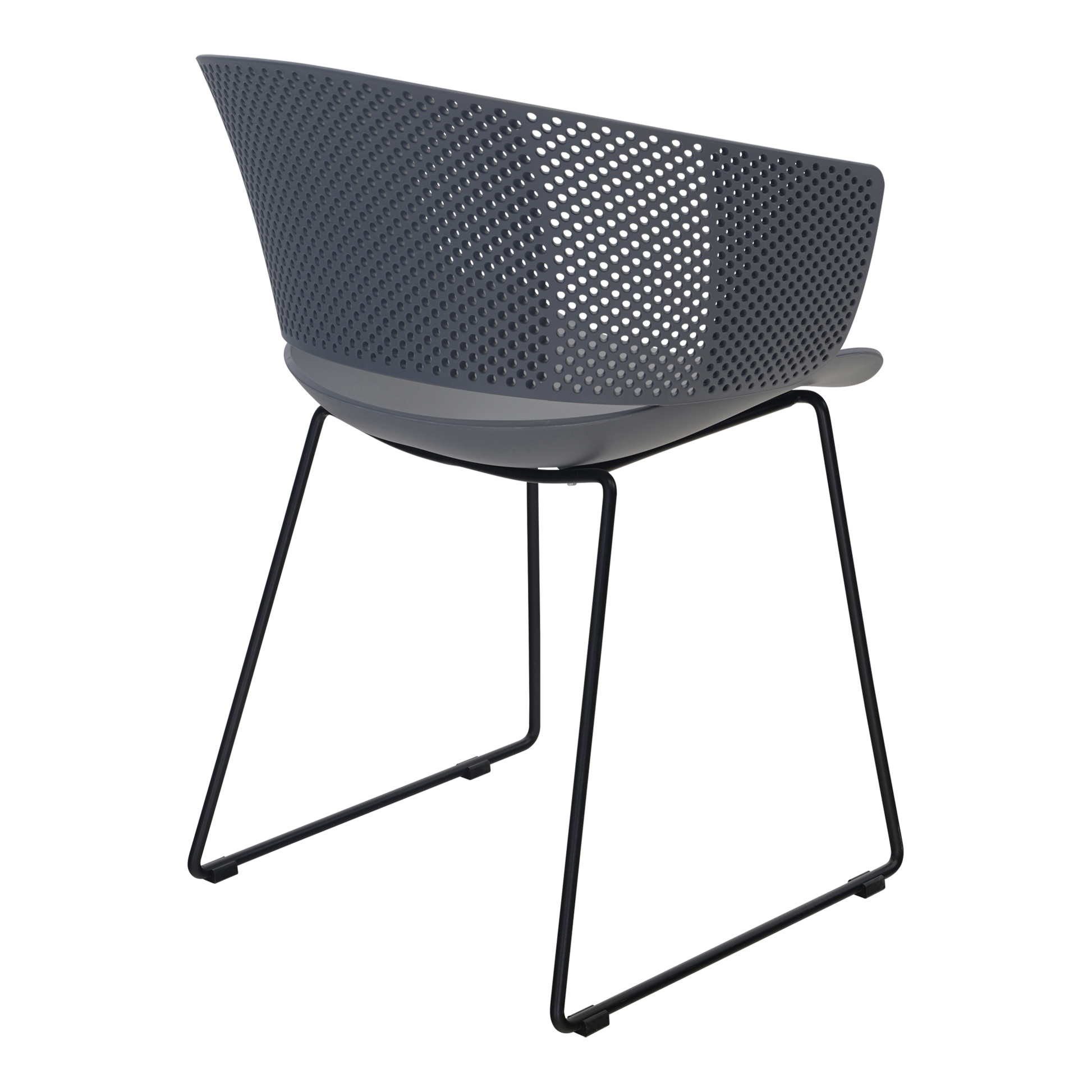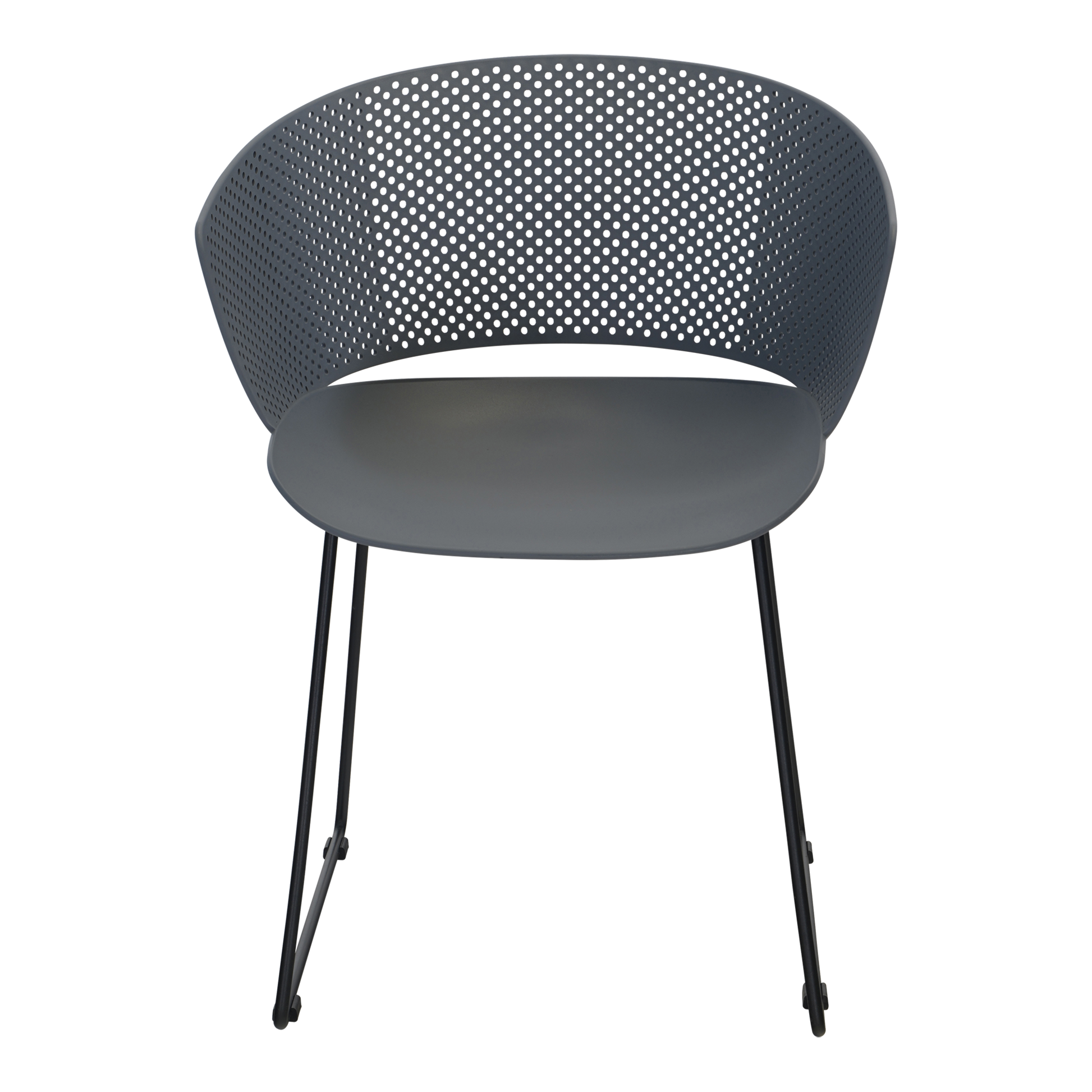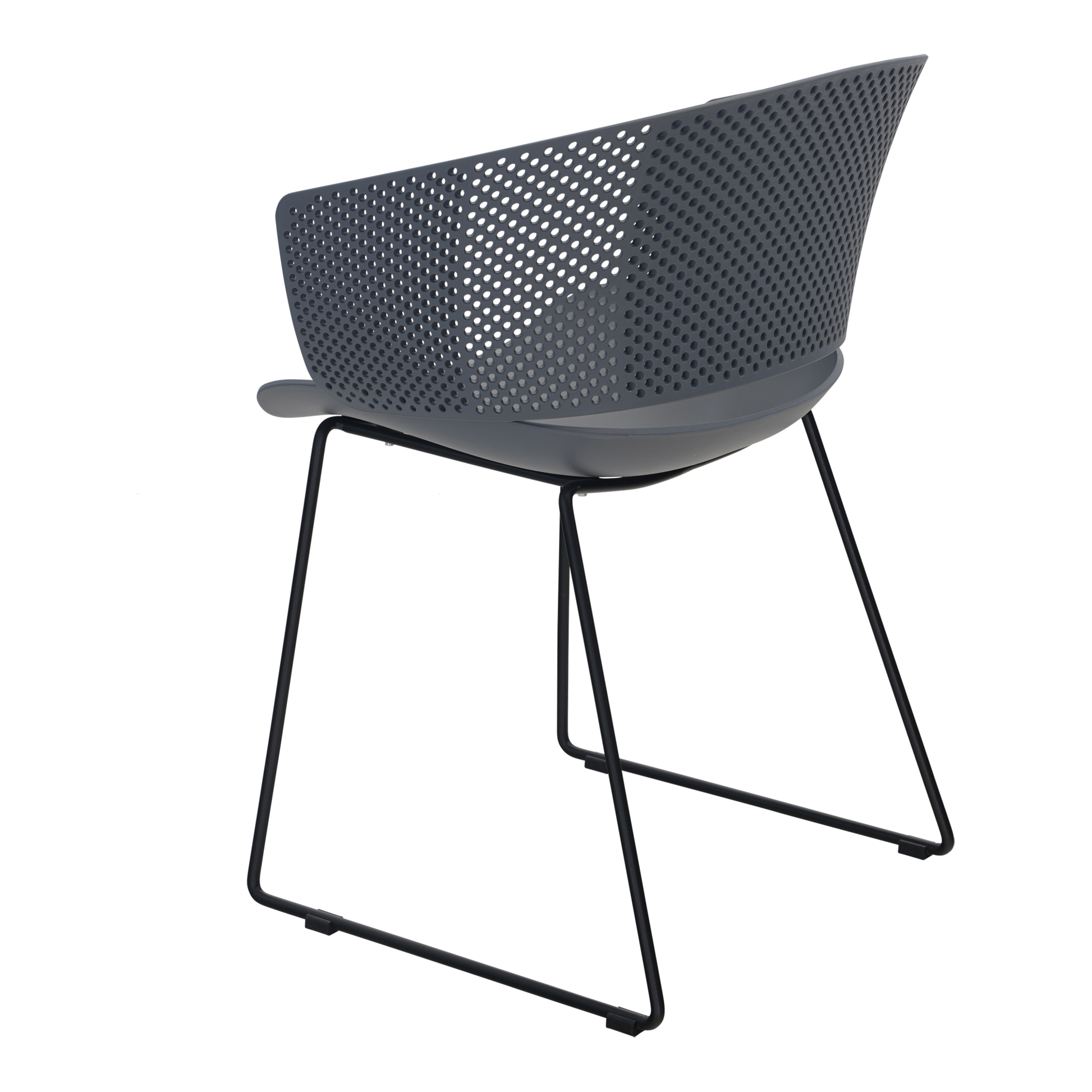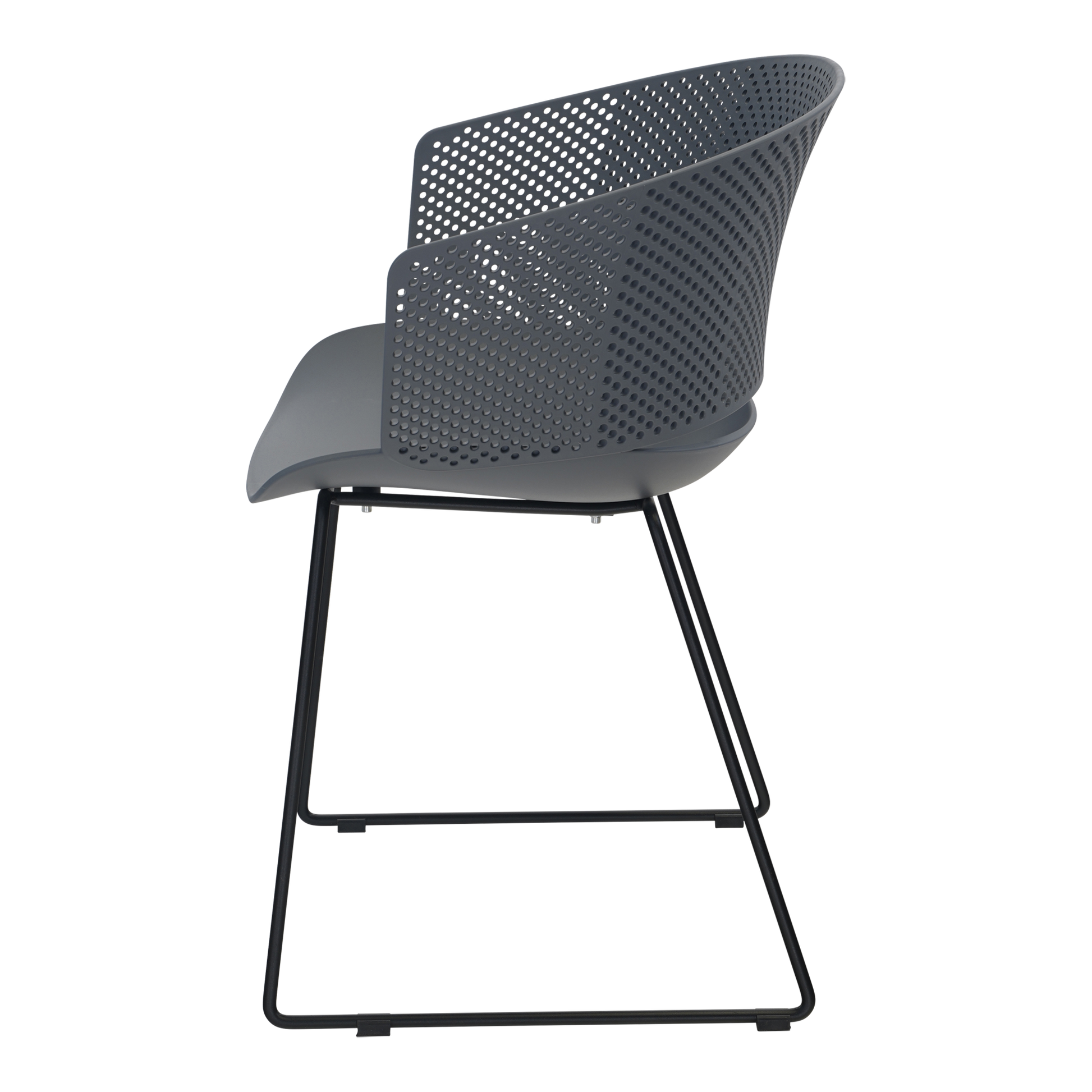 De stoel is verkrijgbaar in drie prachtige kleuren: grijs, zwart en wit. De zitting is gemaakt van hoogwaardig polypropyleen (PP) in grijs, wat zorgt voor een duurzame en weerbestendige zitervaring. De strakke, moderne uitstraling van de zitting wordt perfect gecomplementeerd door de matzwarte stalen poten, die een stevige en stabiele basis bieden.