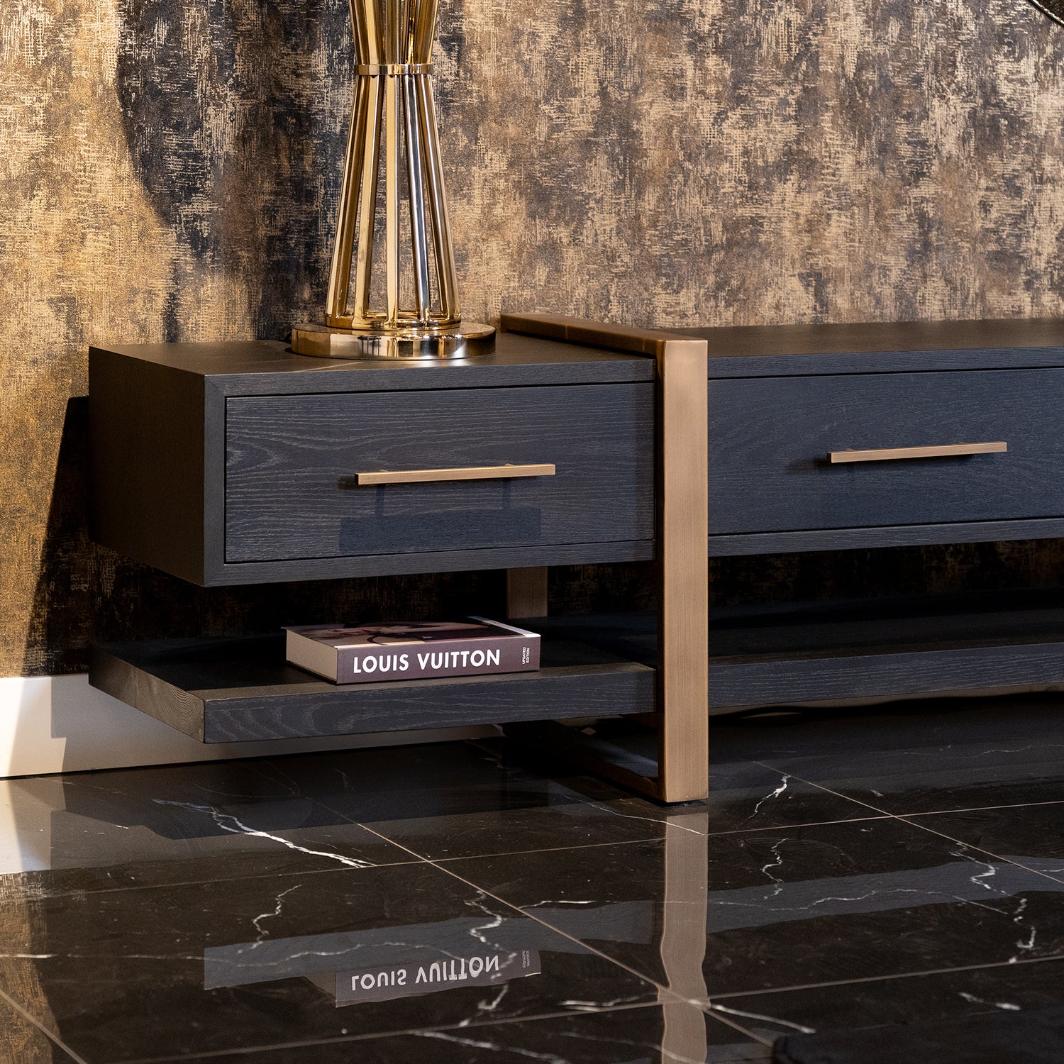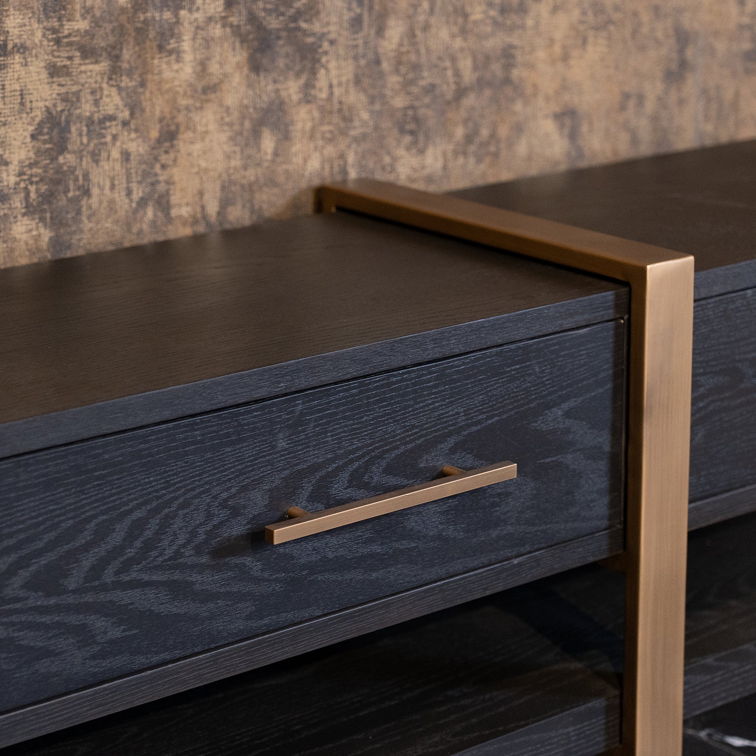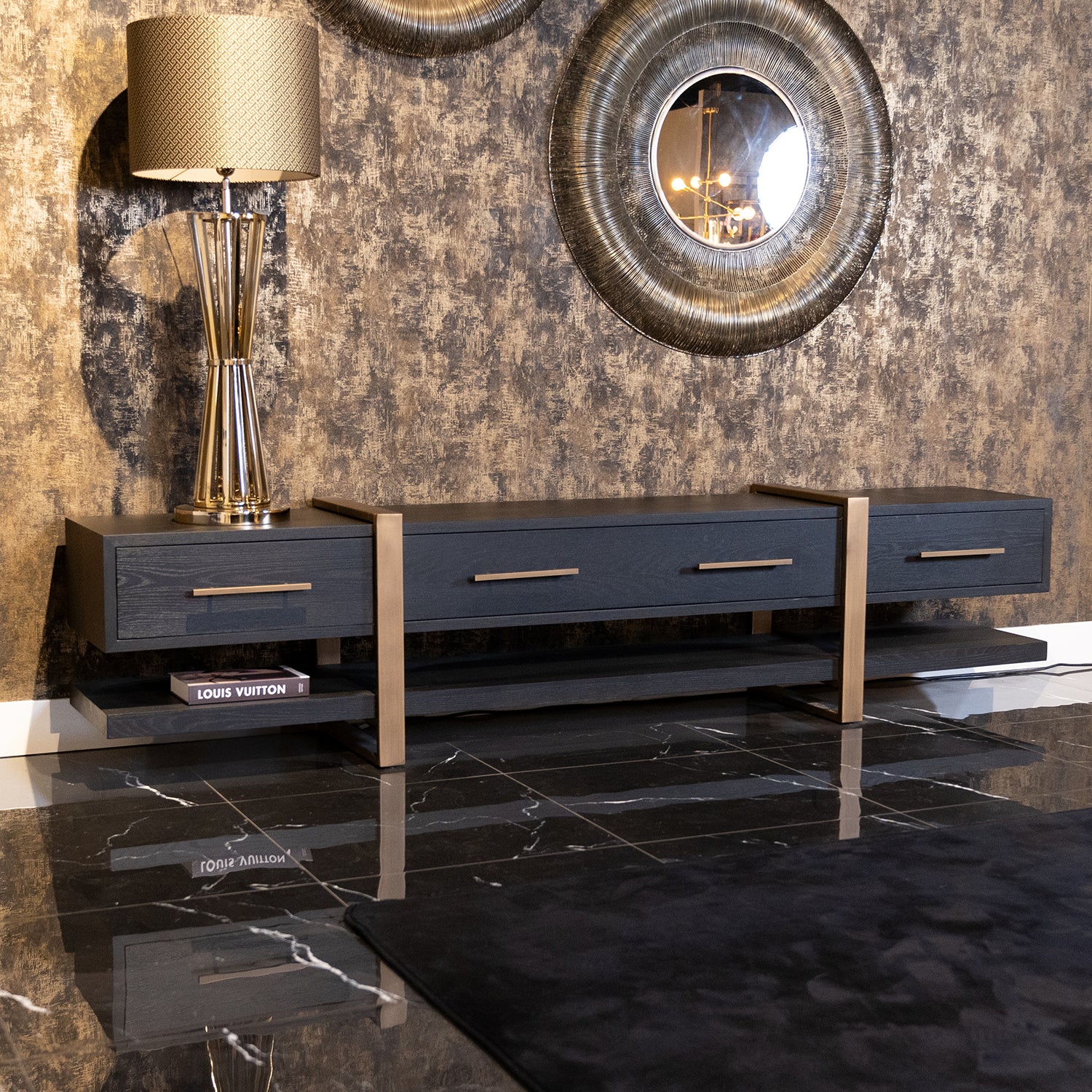 TV-Meubel Cambon is een stoer en modern zwart TV-dressoir met genoeg opbergruimte voor jouw spullen. Het eikenhouten tv-meubel heeft een metalen frame wat zorgt voor een robuuste look.