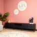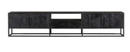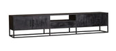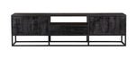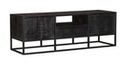 Dit tv meubel komt uit onze ''Liv Black'' serie en heeft verschillende lades, een open vak en verschillende deuren. De kast is uitgevoerd in massief mangohout en is behandeld met een zwarte lak. Het frame en de handgrepen zijn gemaakt van metaal en afgewerkt met een zwarte lak.