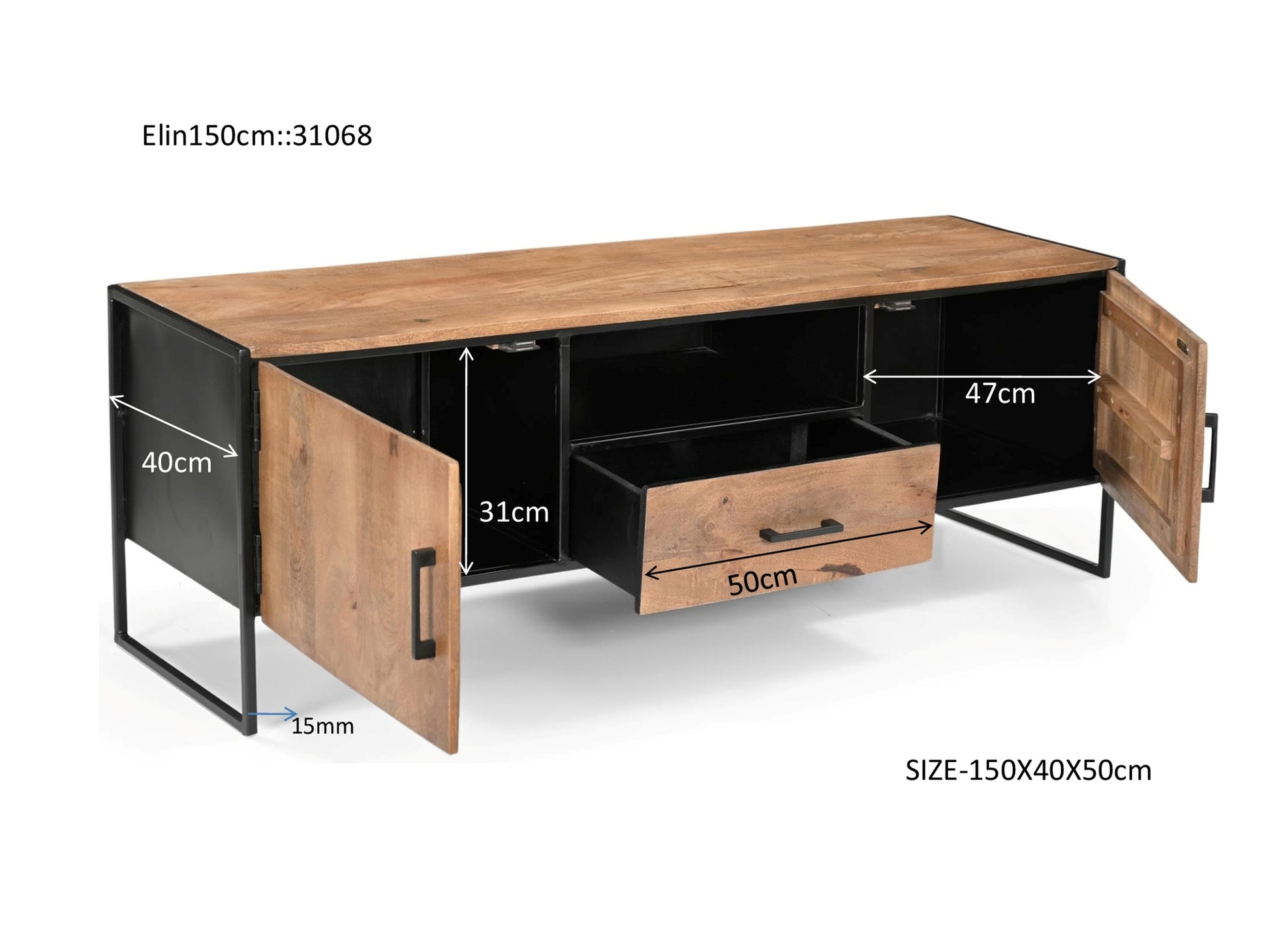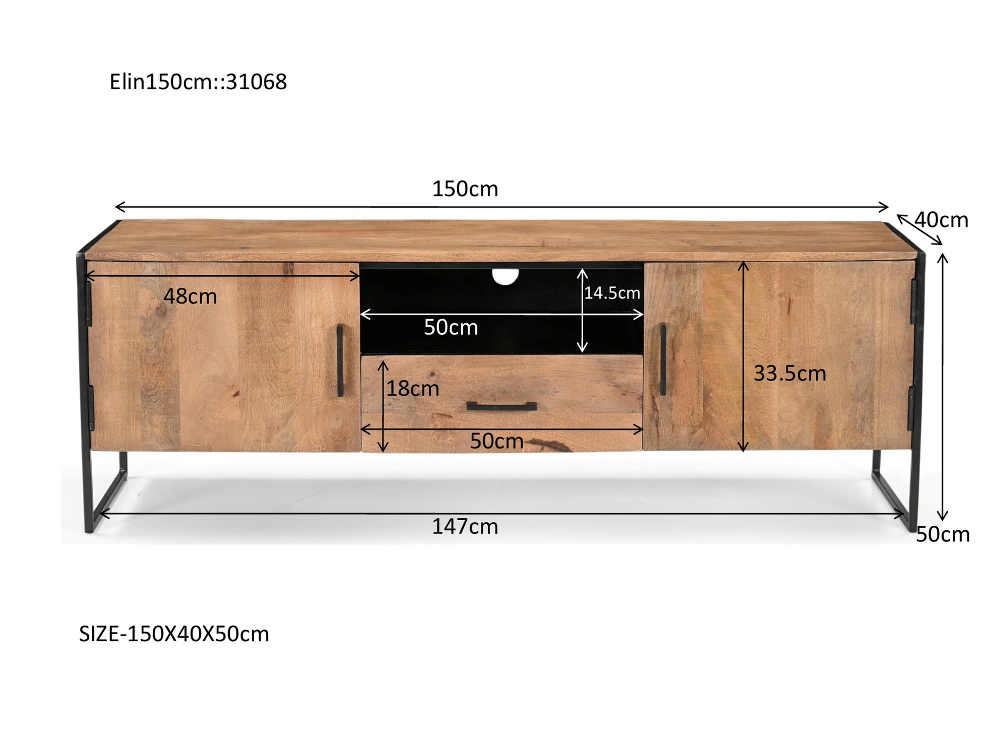 Het TV-meubel Elin van Livingfurn combineert duurzaam mangohout met gecoat staal voor een robuuste, maar verfijnde uitstraling. Met zijn industriële design en warme naturel kleur voegt dit meubel karakter toe aan elke woonkamer. De afmetingen van 150x40x50 cm maken het geschikt voor diverse ruimtes, terwijl de praktische indeling met een lade en twee deuren zorgt voor voldoende opbergruimte voor multimedia-apparatuur en accessoires.
