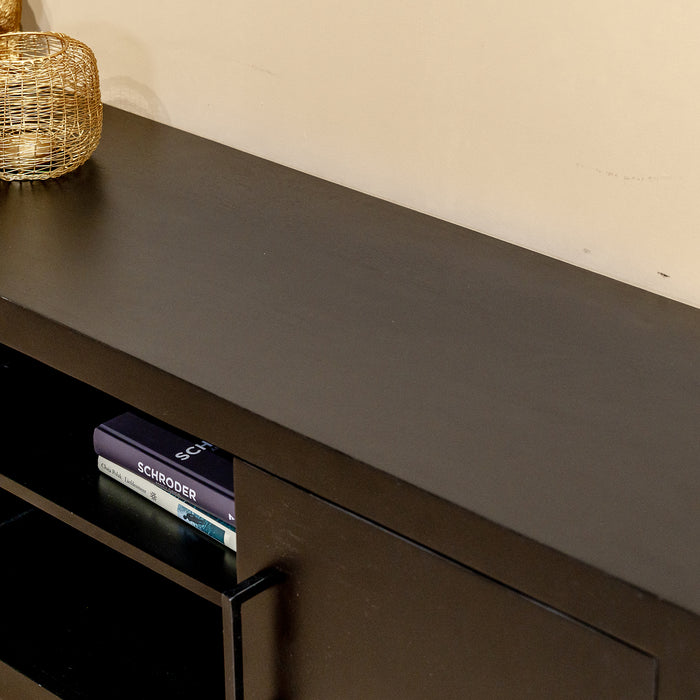 Op zoek naar het perfecte tv-meubel dat zowel stijlvol als functioneel is? Maak kennis met ons TV-Meubel Jaxx, een schitterend meubelstuk gemaakt van massief mangohout in een diepe, elegante zwarte afwerking.