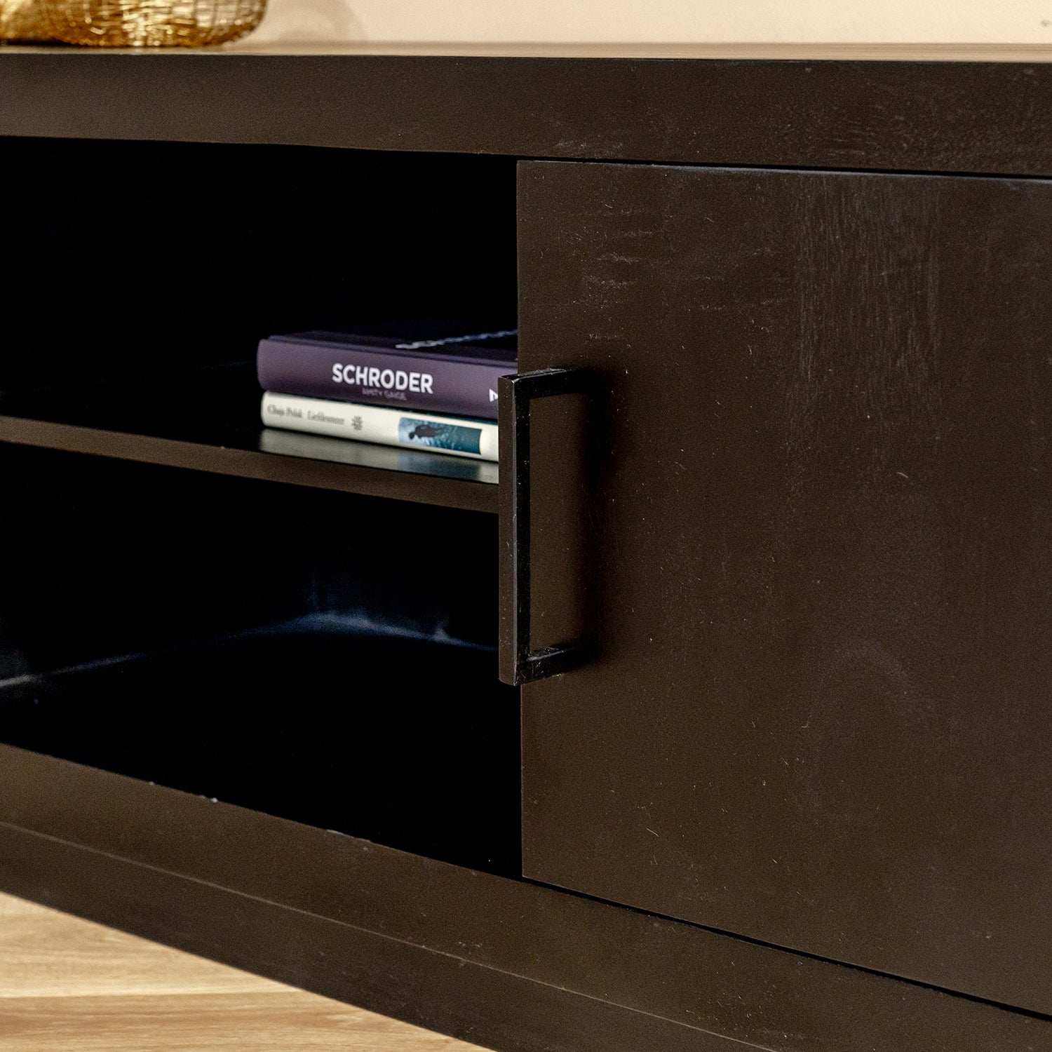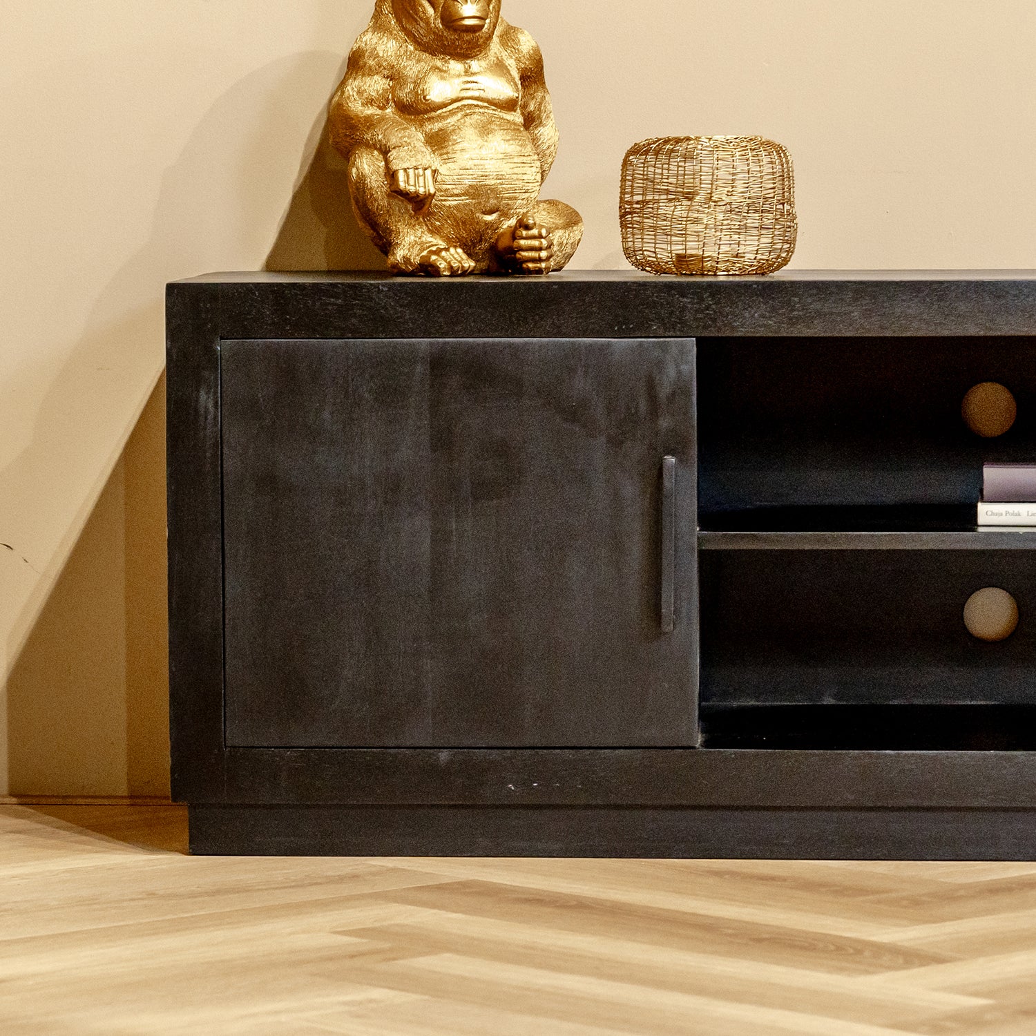 Op zoek naar het perfecte tv-meubel dat zowel stijlvol als functioneel is? Maak kennis met ons TV-Meubel Jaxx, een schitterend meubelstuk gemaakt van massief mangohout in een diepe, elegante zwarte afwerking.