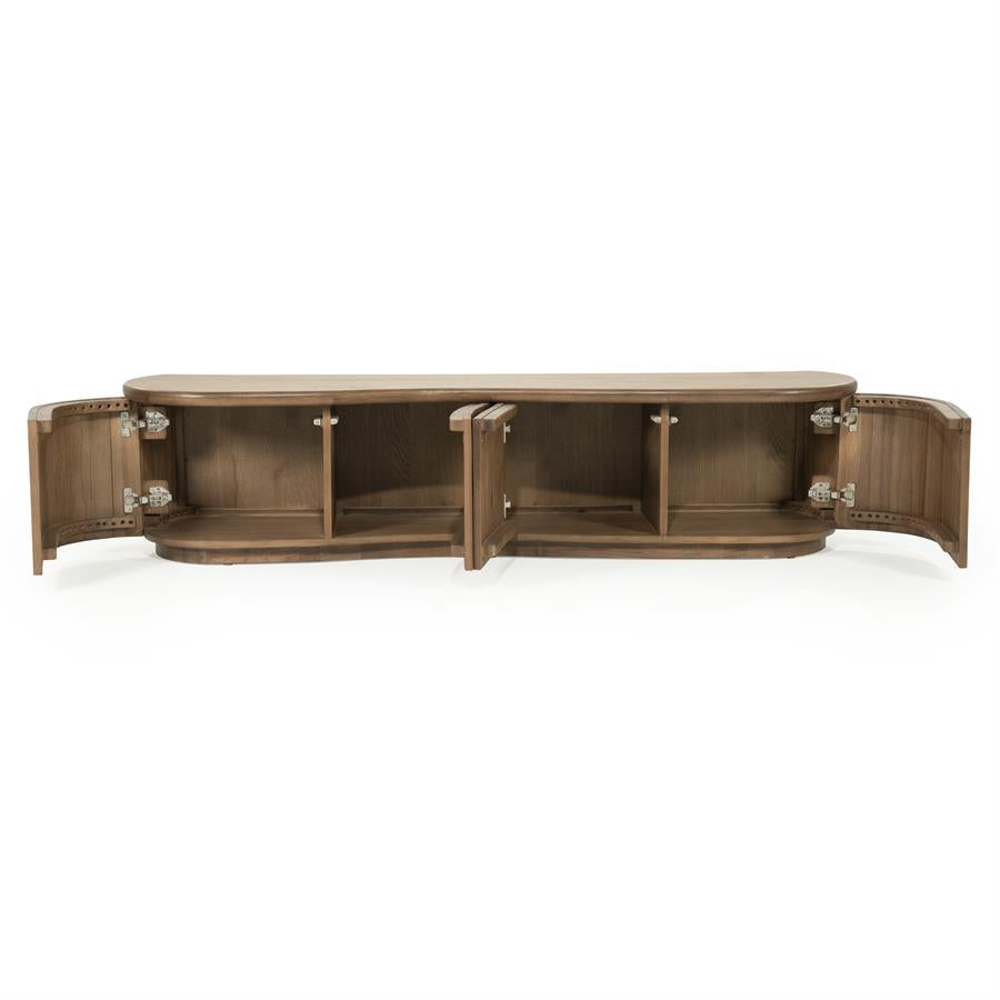 De TV meubel Josh - Bruin Eikenhout van Eleonora is een toonbeeld van minimalistisch design met een warme uitstraling. Vervaardigd uit massief eikenhout en eiken fineer, biedt dit meubel niet alleen een solide basis voor je televisie, maar ook volop opbergruimte voor randapparatuur, kabels en accessoires. De bruine kleurafwerking laat de houtnerf prachtig tot zijn recht komen, terwijl het verticale lijnenspel op de deuren zorgt voor een modern accent.