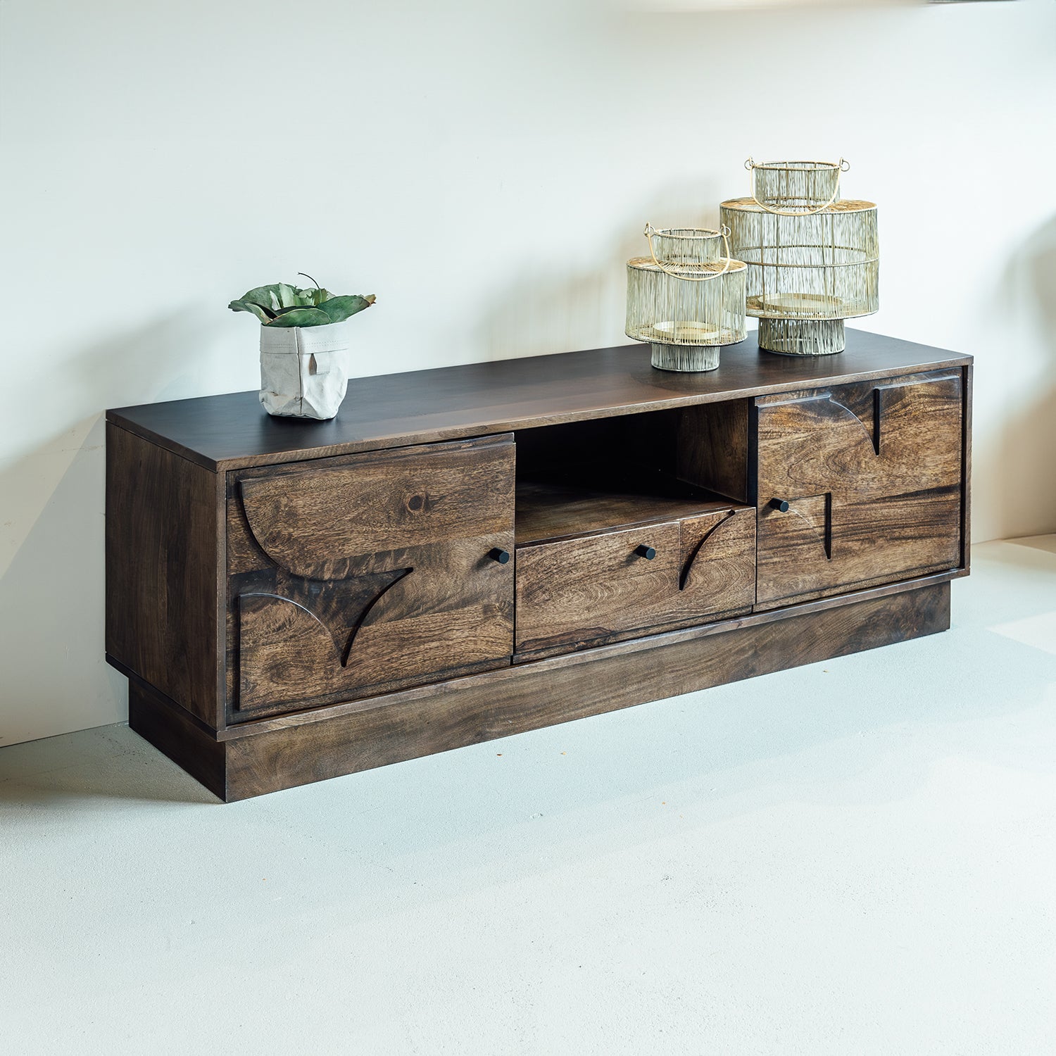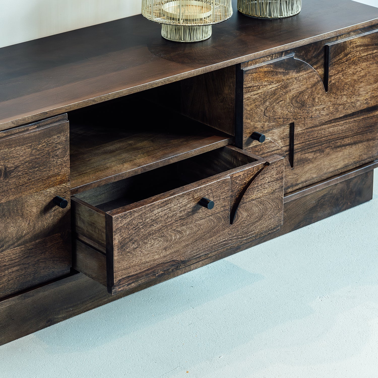 Met zijn natuurlijke nerf en rijke walnootkleur brengt dit TV-meubel een warme en authentieke uitstraling in huis. Mangohout is niet alleen duurzaam, maar ook sterk, waardoor het meubel jarenlang meegaat. De drie deuren bieden voldoende ruimte om je tv-accessoires, afstandsbedieningen en andere items netjes op te bergen.
