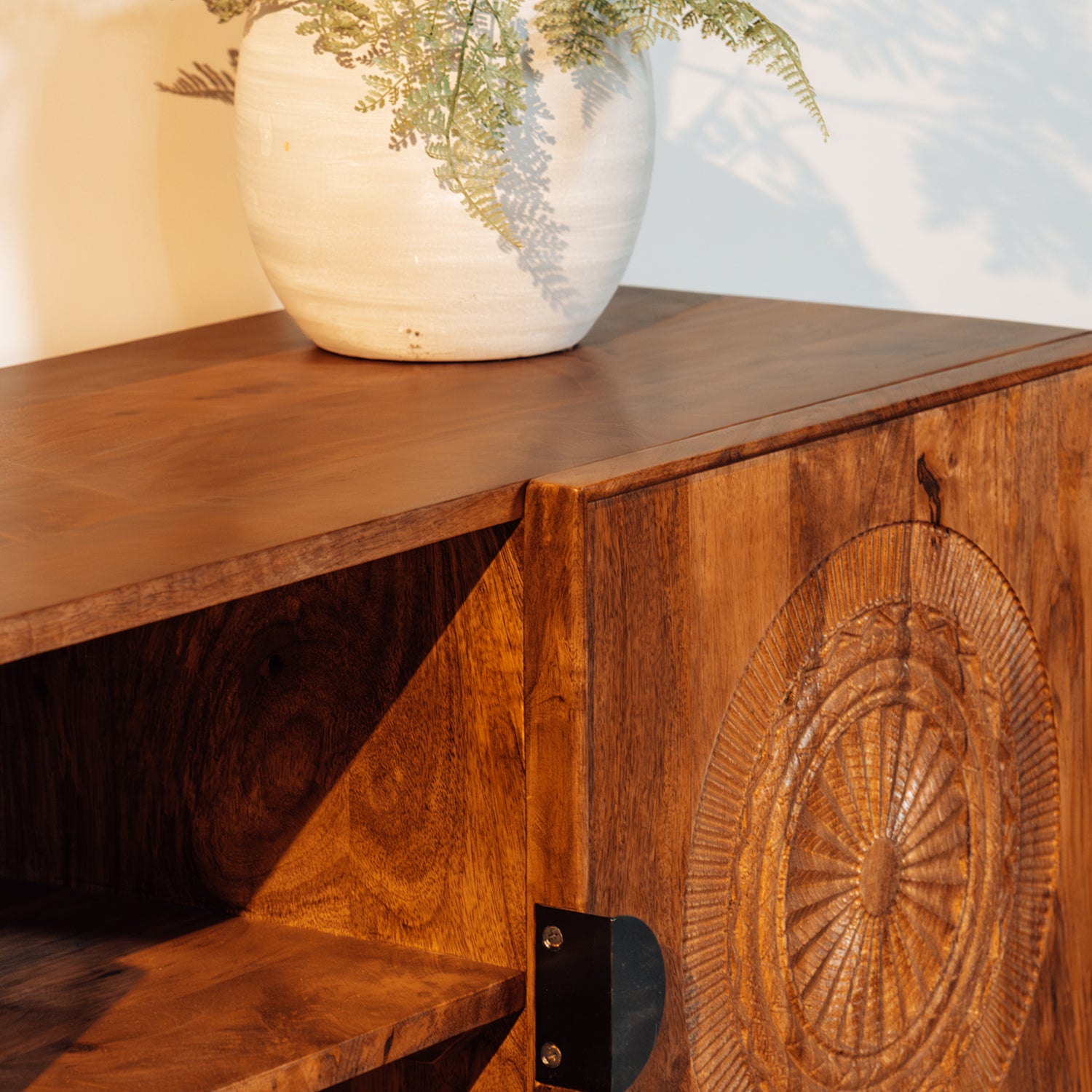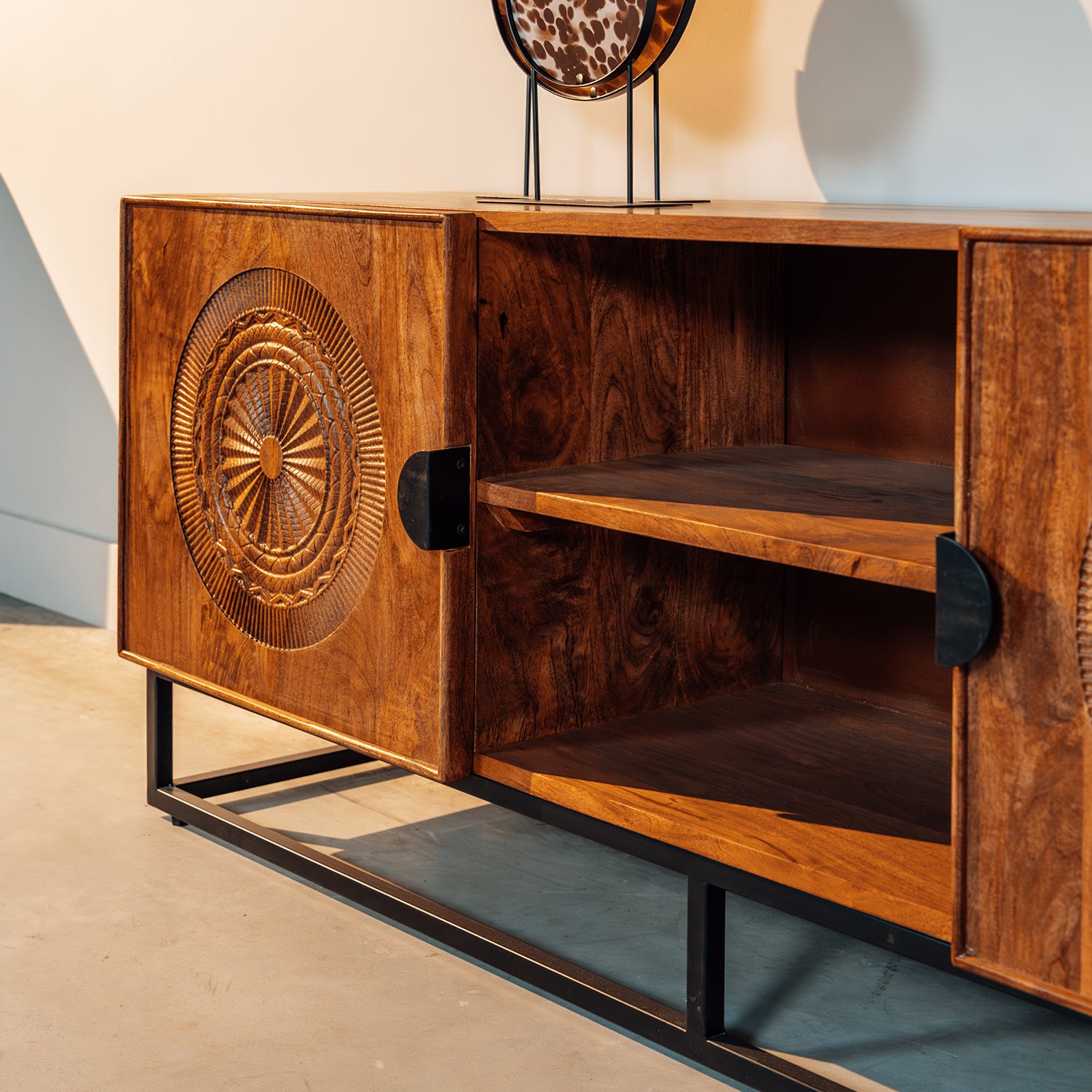 Met zijn combinatie van mangohout en robuuste, industriële stalen poten is de tv-dressoir Maya niet alleen functioneel, maar ook een stijlvolle blikvanger. Het biedt voldoende opbergruimte voor al je multimedia-apparatuur, zonder in te leveren op design. Dankzij de natuurlijke kleur en het sterke, onderhoudsvriendelijke materiaal past deze mangohouten tv-dressoir perfect in verschillende interieurstijlen, van modern tot industrieel.