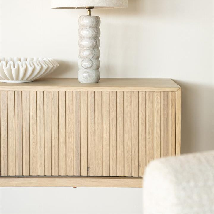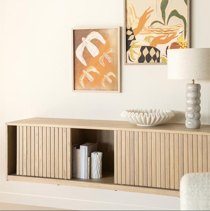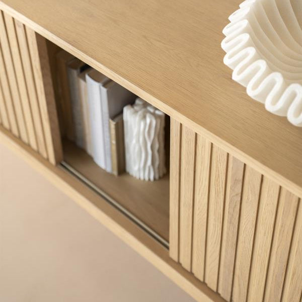 Het TV meubel Milo – naturel van Eleonora combineert een strak Scandinavisch design met de warme uitstraling van natuurlijk eikenhout. Met zijn royale breedte van 240 cm biedt dit meubel niet alleen ruimte voor je televisie, maar ook voor decoratieve items en media-apparatuur. De combinatie van massief eikenhout en eikenfineer zorgt voor een duurzame en stijlvolle afwerking.
