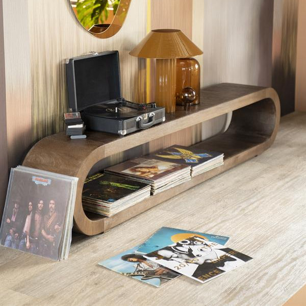 De By-Boo TV-Meubel Elora in bruin is een elegante toevoeging aan uw interieur. Gemaakt van hoogwaardig mangohout, straalt deze tafel zowel warmte als moderniteit uit.