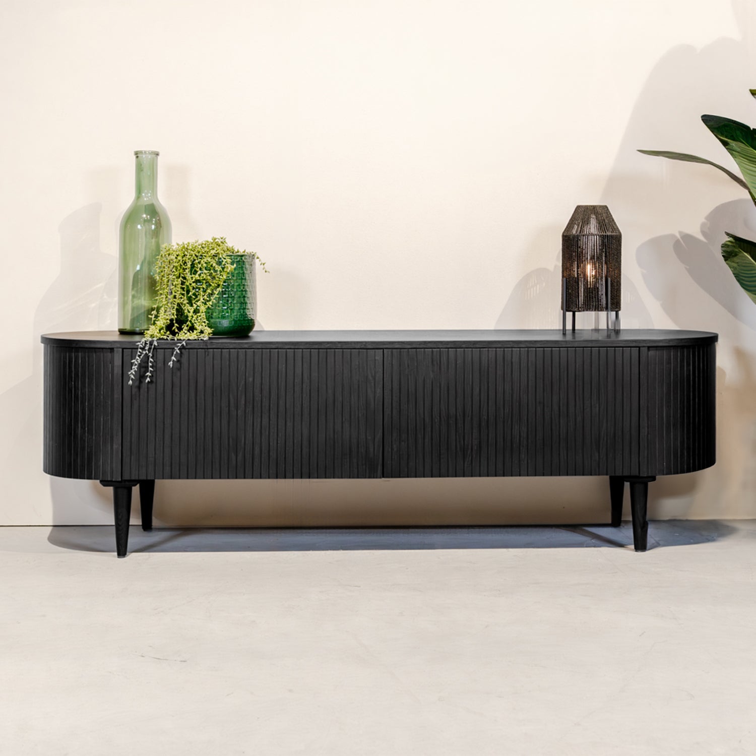 Maak kennis met onze TV-Meubel Oliva in Zwart Eikenhout. Dit eikenfineer meubelstuk is niet alleen functioneel, maar ook een echte eyecatcher. Oliva biedt twee vakken, elk afgesloten met een druksysteem, waardoor je spullen stijlvol worden opgeborgen. Dit TV-Meubel is afgewerkt met ronden hoeken en dunne latjes.
