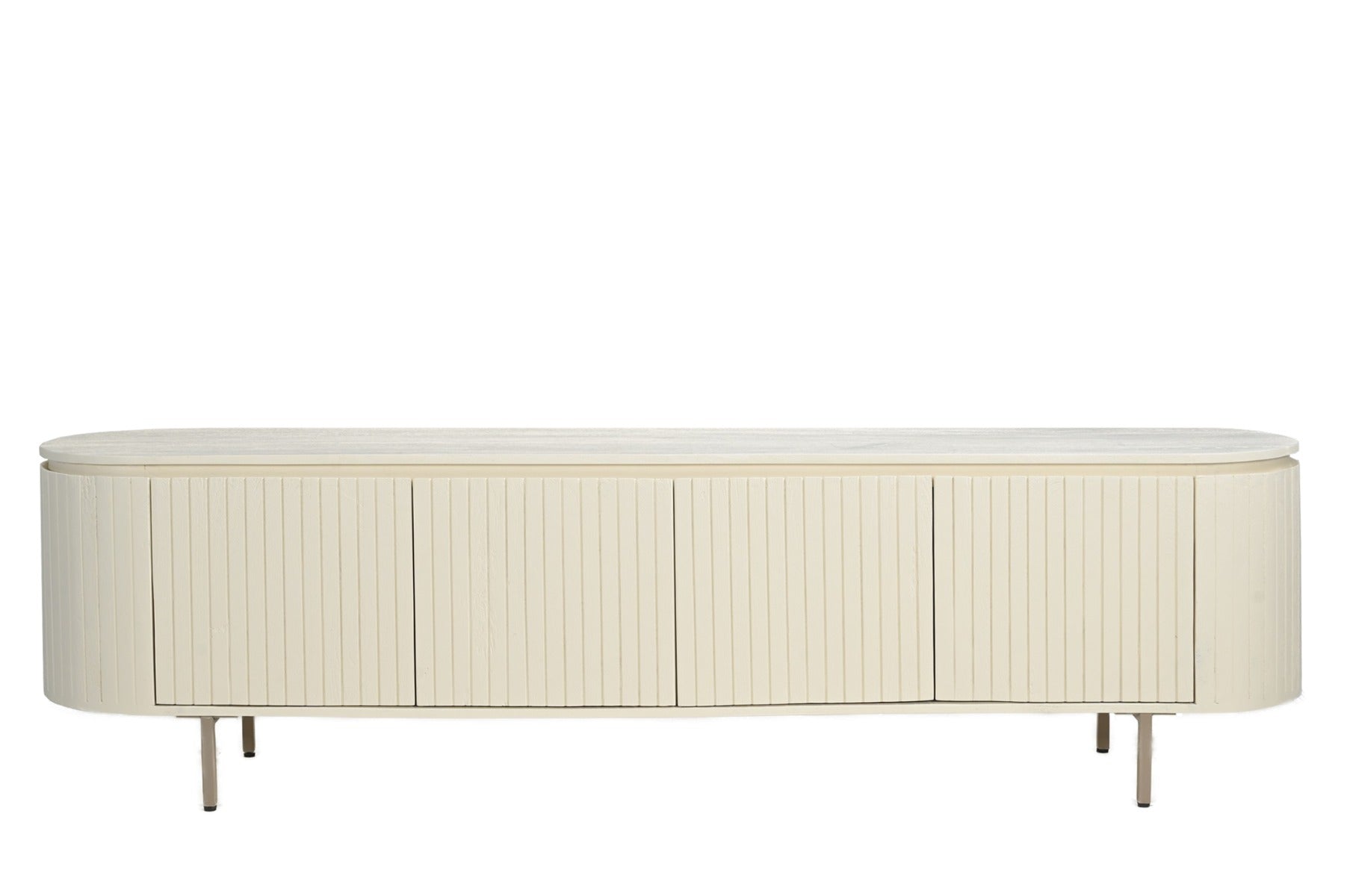 TV-meubel Patou van Livingfurn is een perfecte balans tussen robuustheid en verfijning. Vervaardigd uit massief mangohout met een beige afwerking en voorzien van stijlvolle visgraatdetails, straalt dit meubel luxe en karakter uit. Het strakke metalen onderstel en de minimalistische grepen geven het geheel een moderne, industriële look die perfect past in eigentijdse woonkamers.